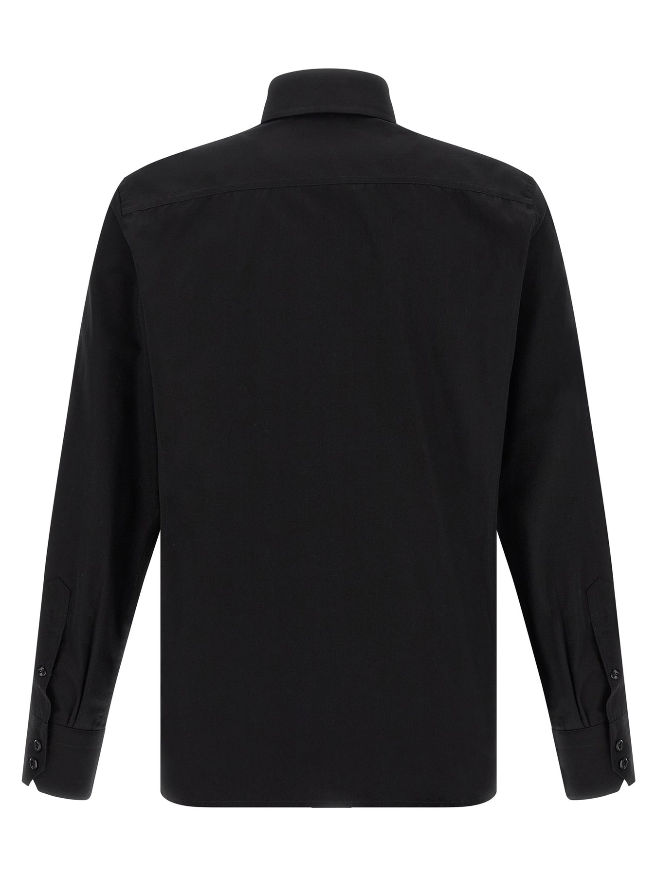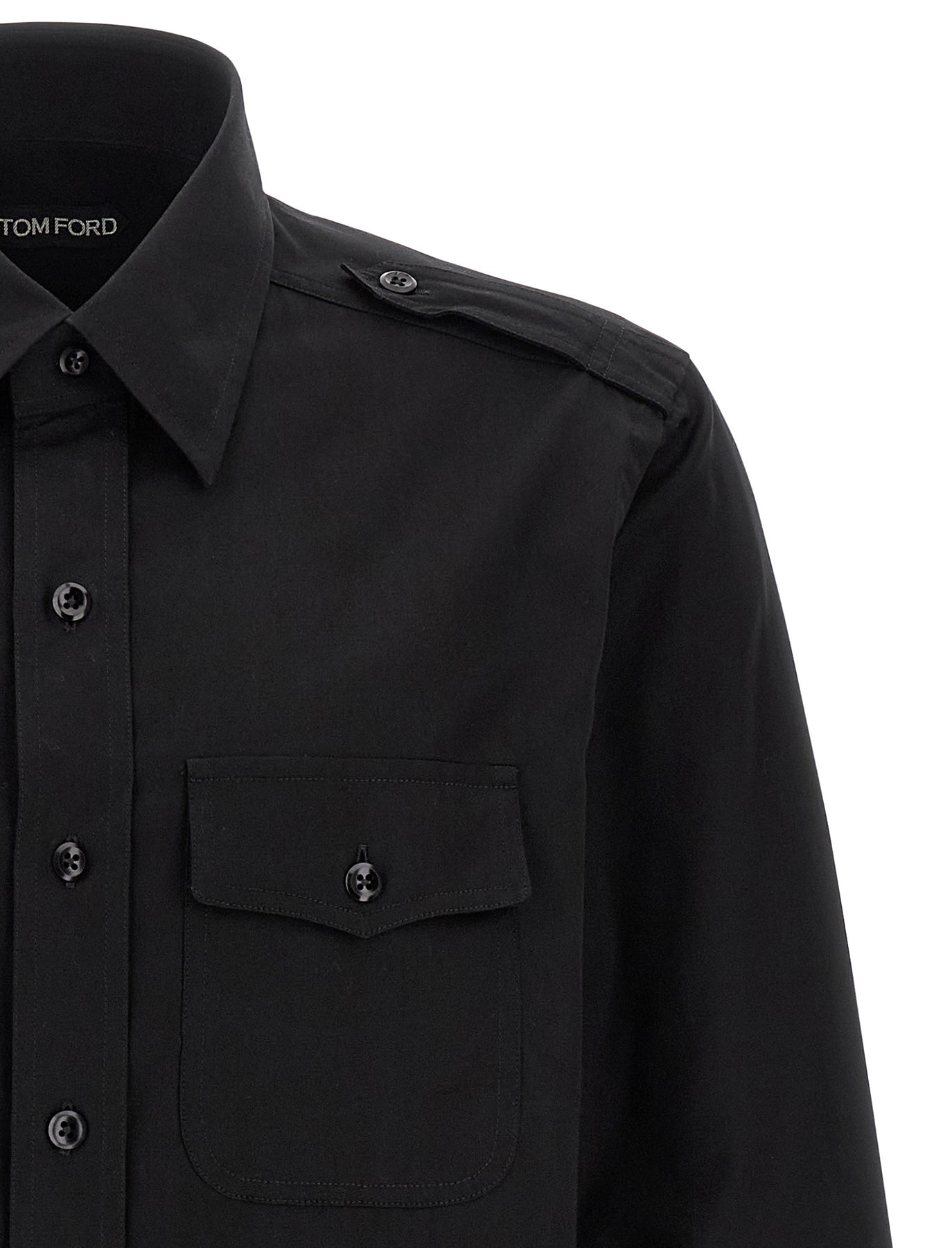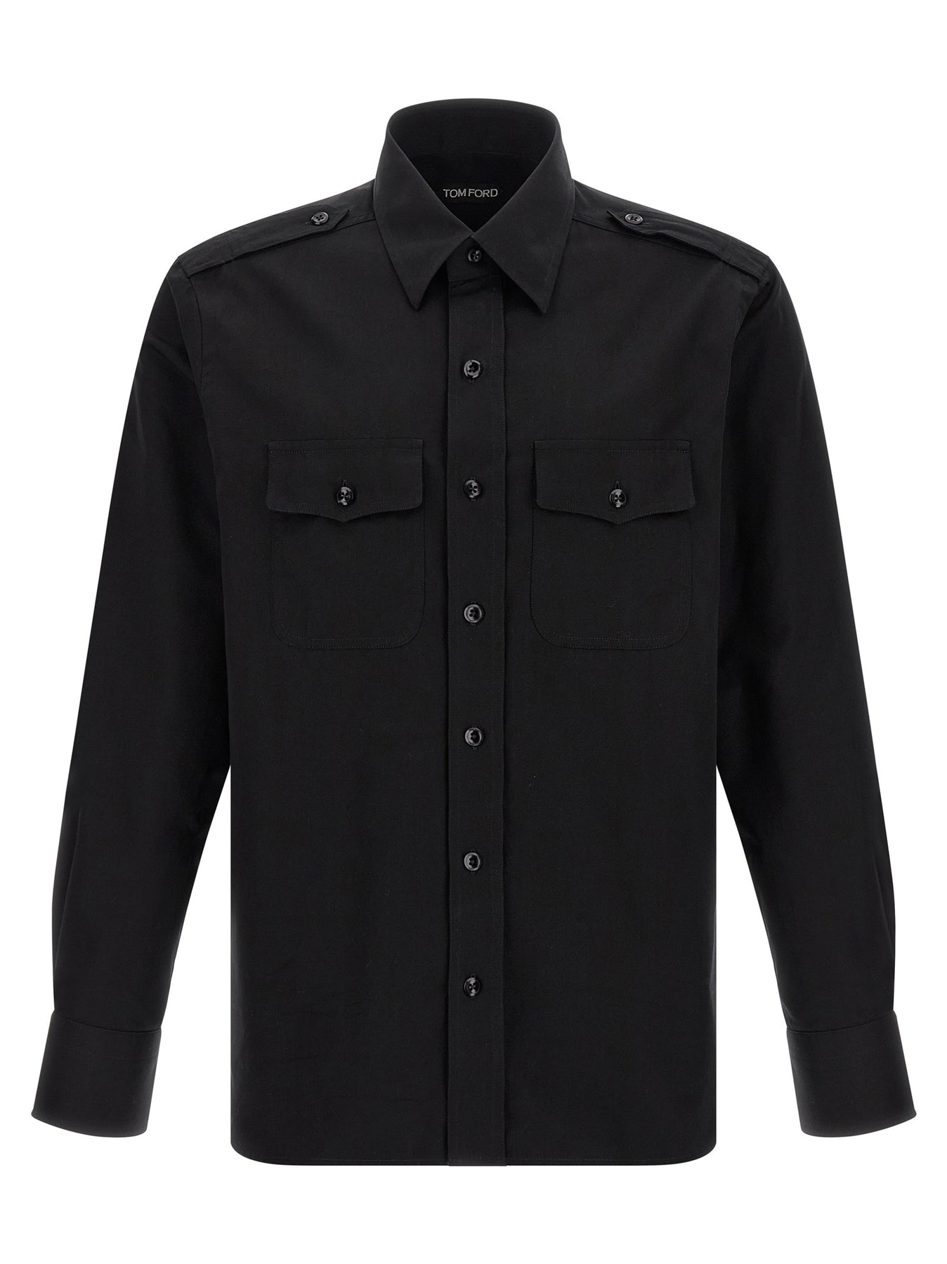 'Military' cotton blend, silk and faille shirt, front button closure, pockets, badges, long cuffed sleeves.
