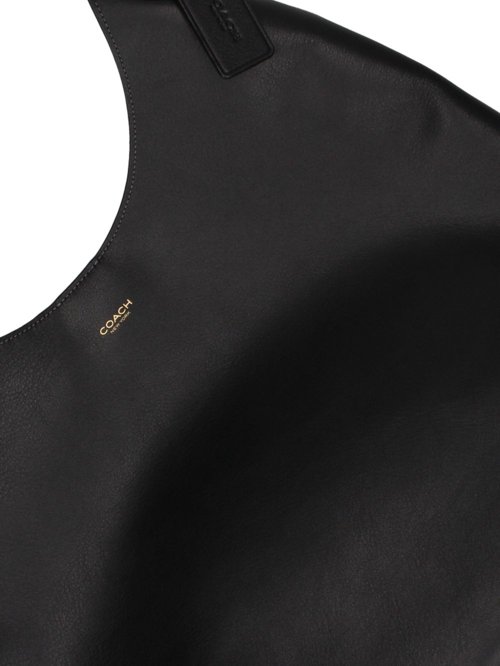 black leather logo stamp to the front single top handle magnetic fastening main compartment internal patch pocket