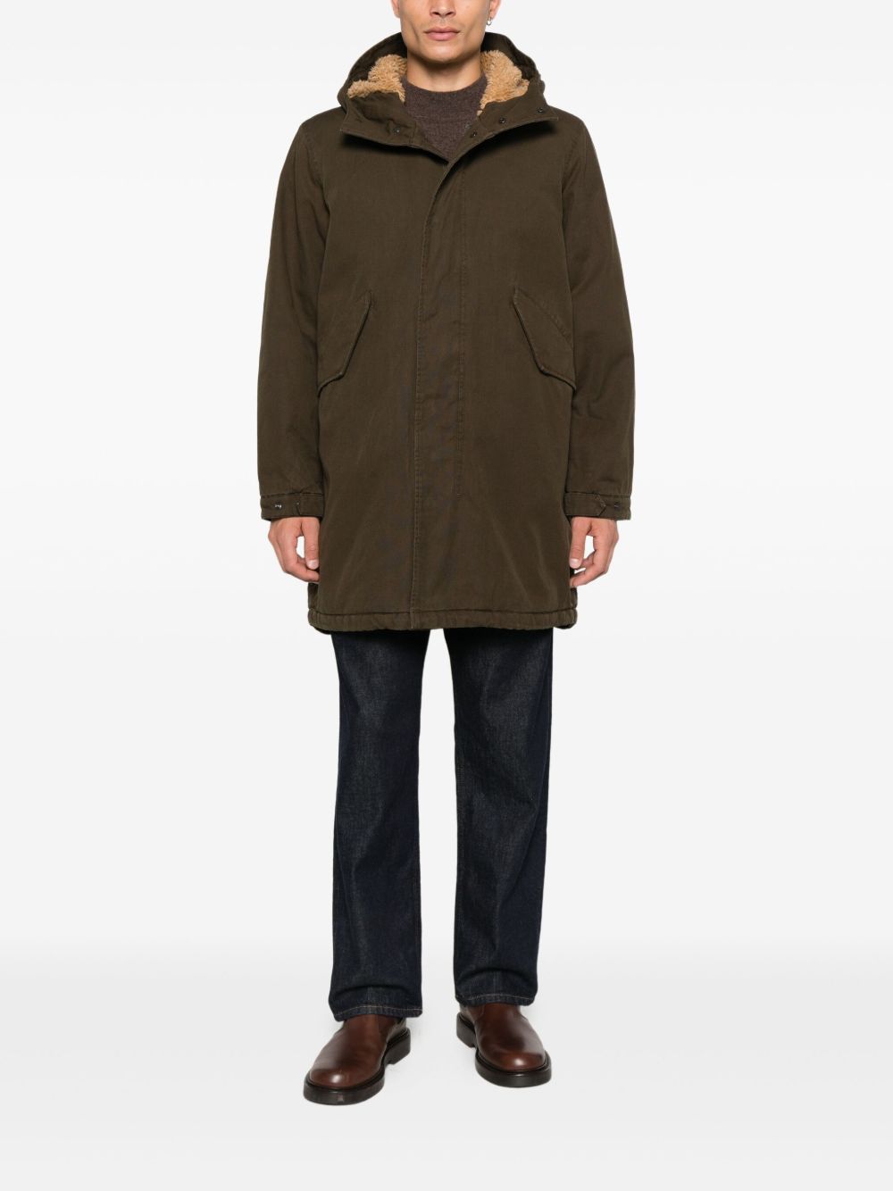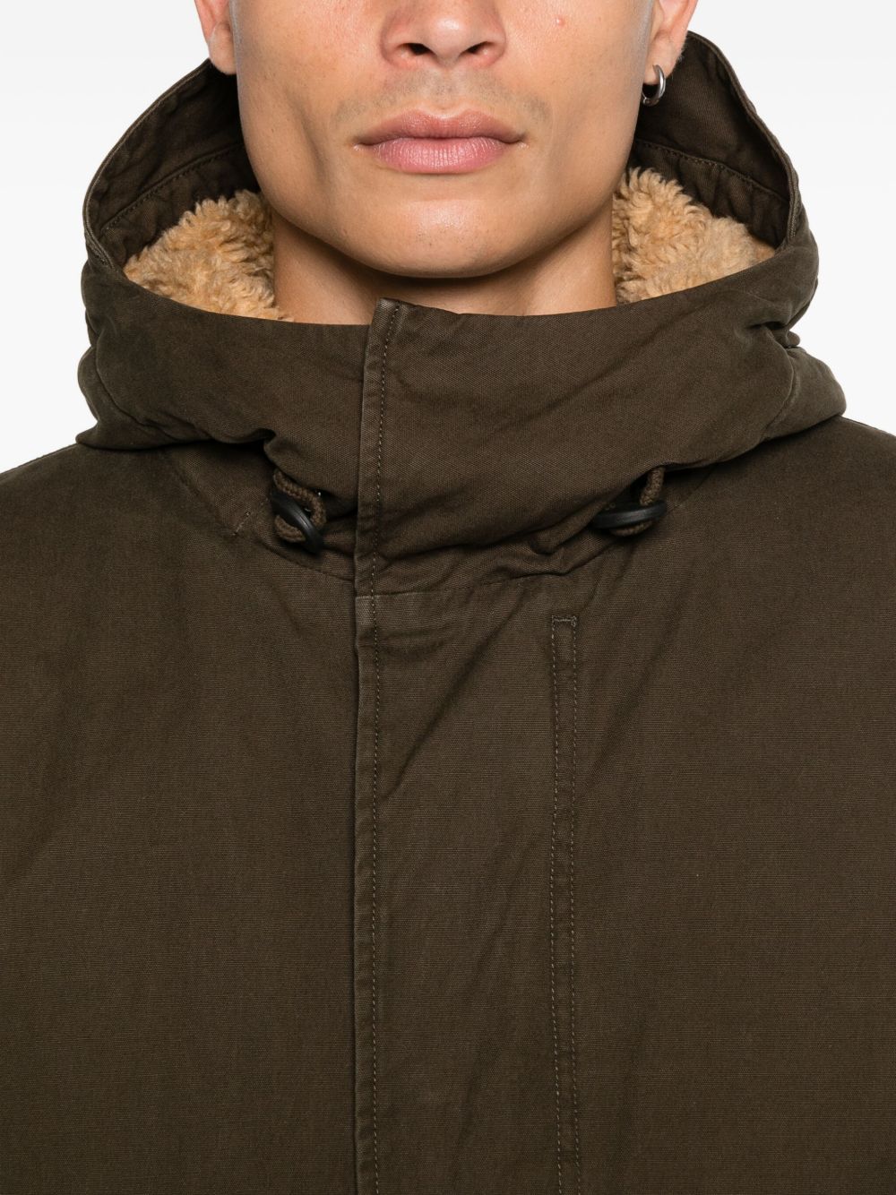 green concealed front press-stud and zip fastening drawstring hood