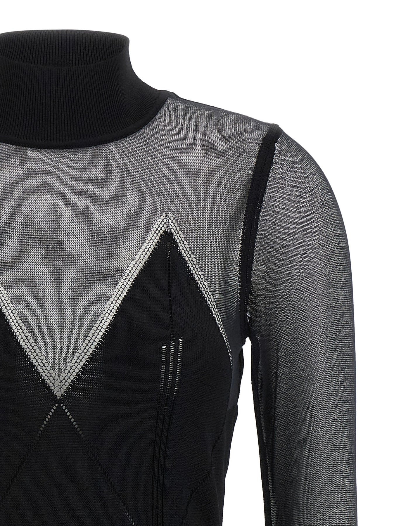 Mini dress in viscose and stretch cotton blend with superior transparencies, high neck, long cuffed sleeves, and band on the hem.