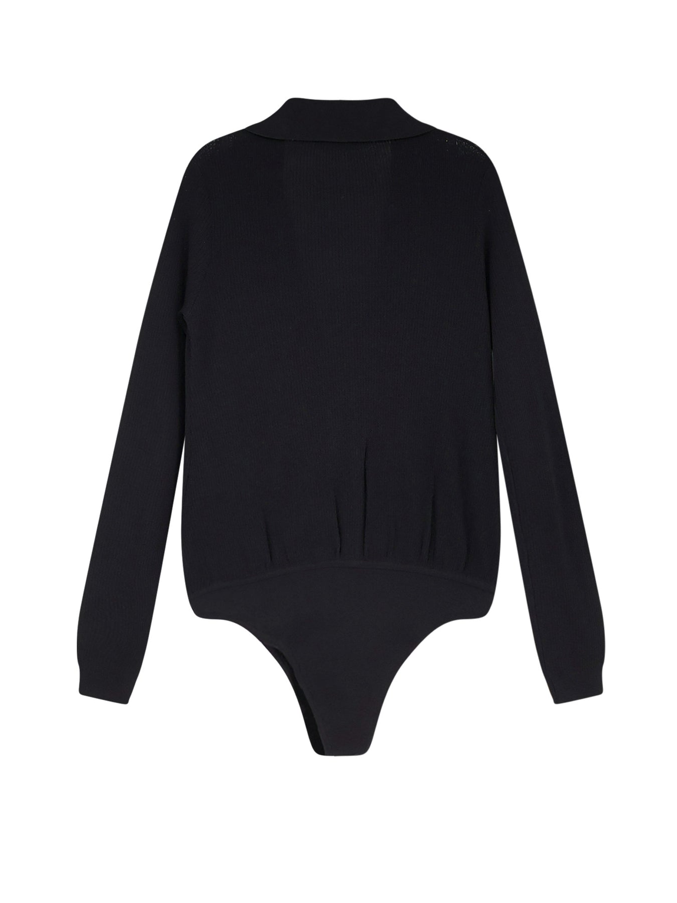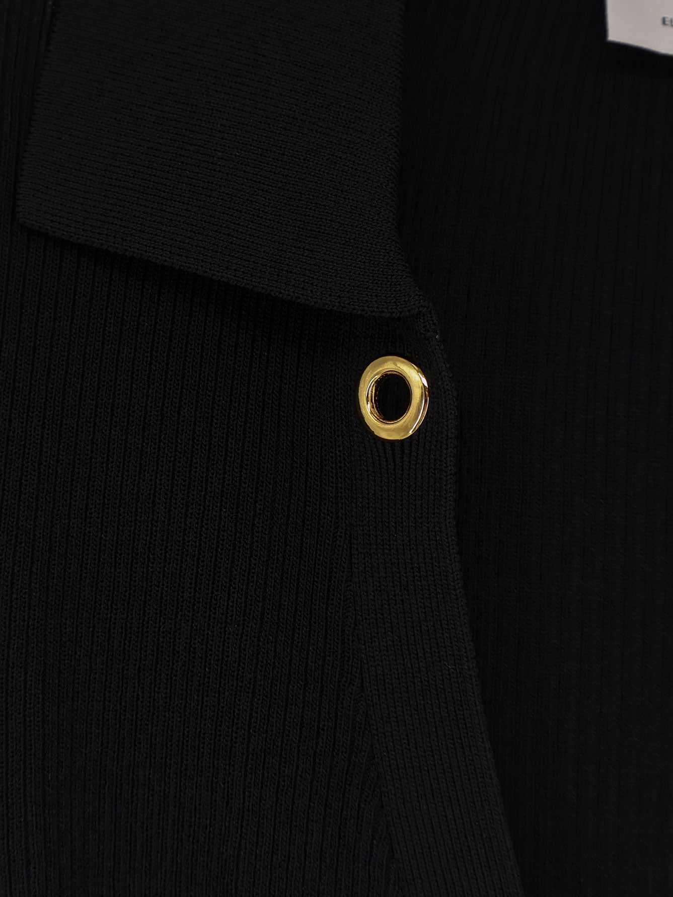 Hook closure at the bottom Deep V-neckline and classic collar Metal chain detail with logo Long sleeves 75% viscose, 15% polyamide, 10% silk SKU: BK75B56E2110