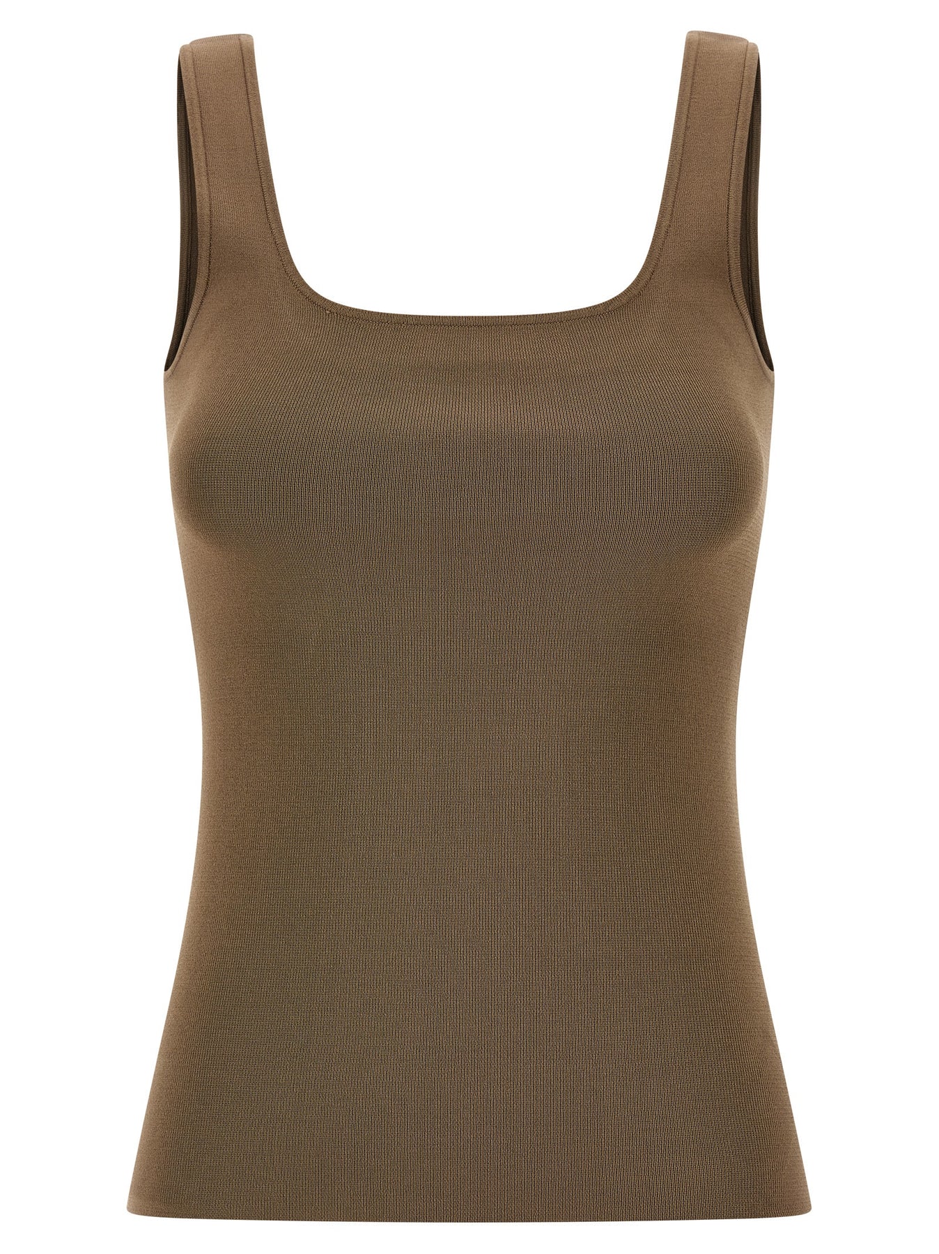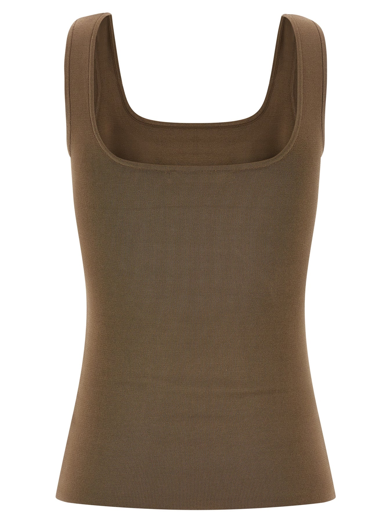 Fitted viscose knit top, square neckline at the front and back, wide shoulder straps.