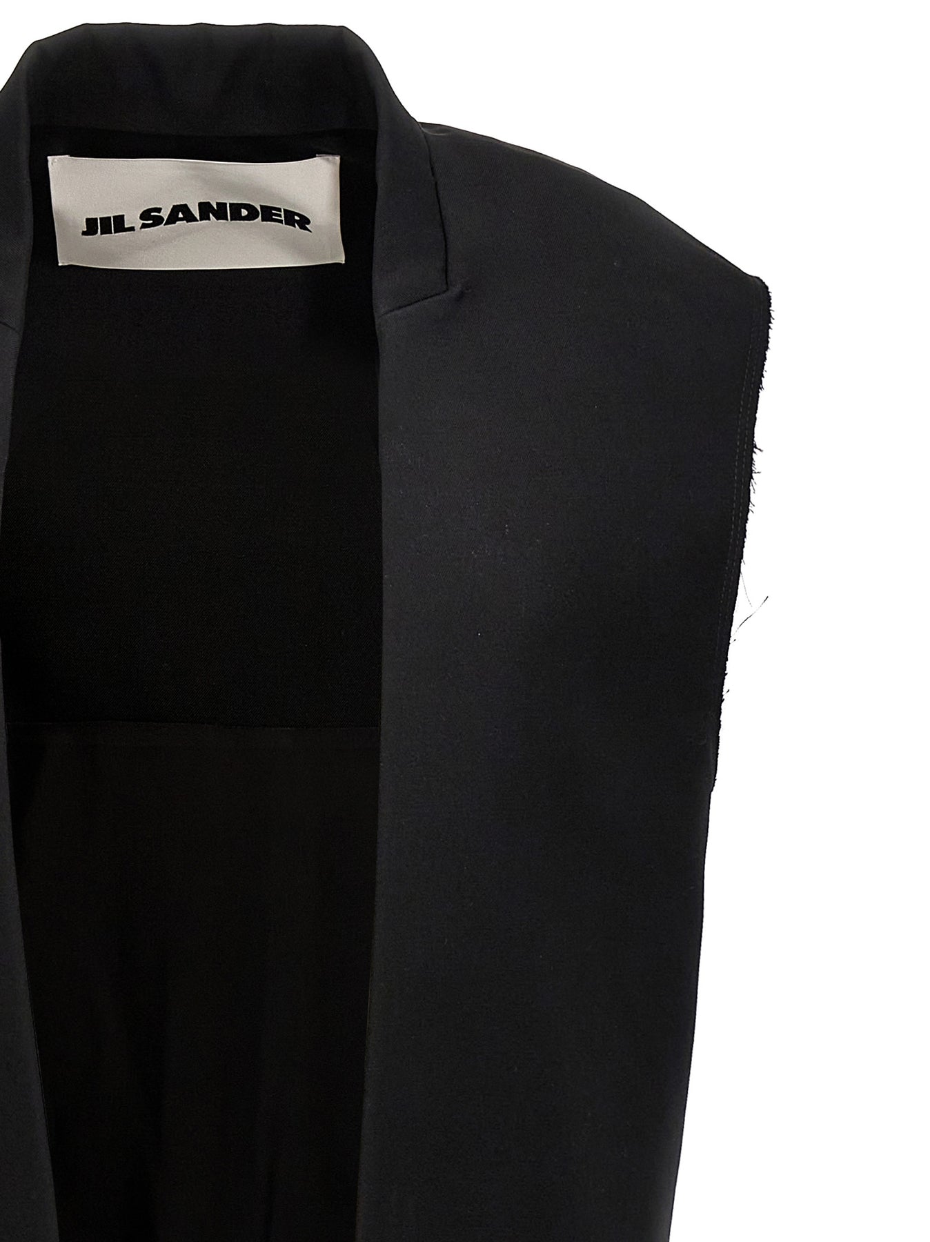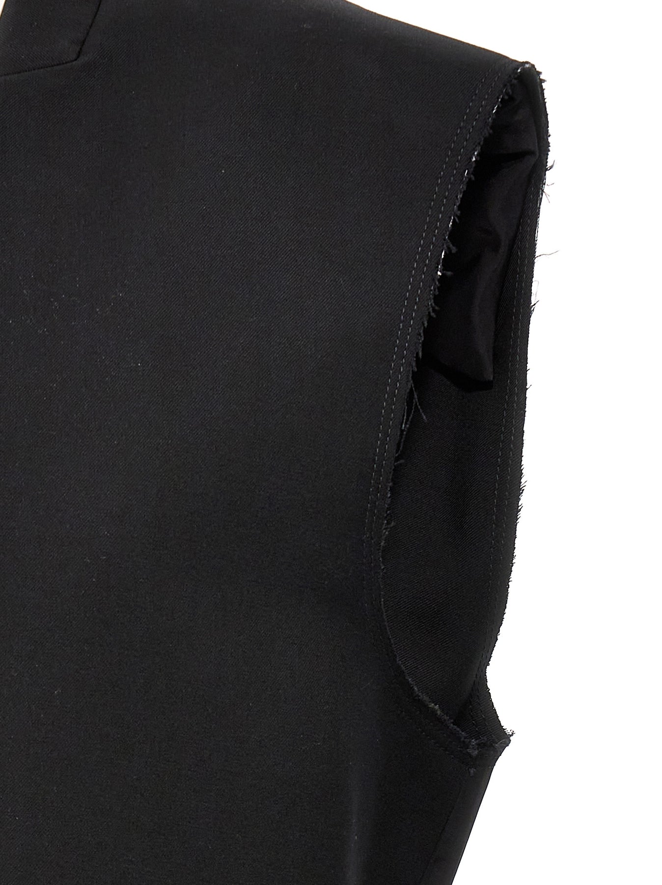 Long two-material viscose vest with top part in a top fabric, bottom part in a fluid satin-style fabric, and a removable belt closure with buckle-free.