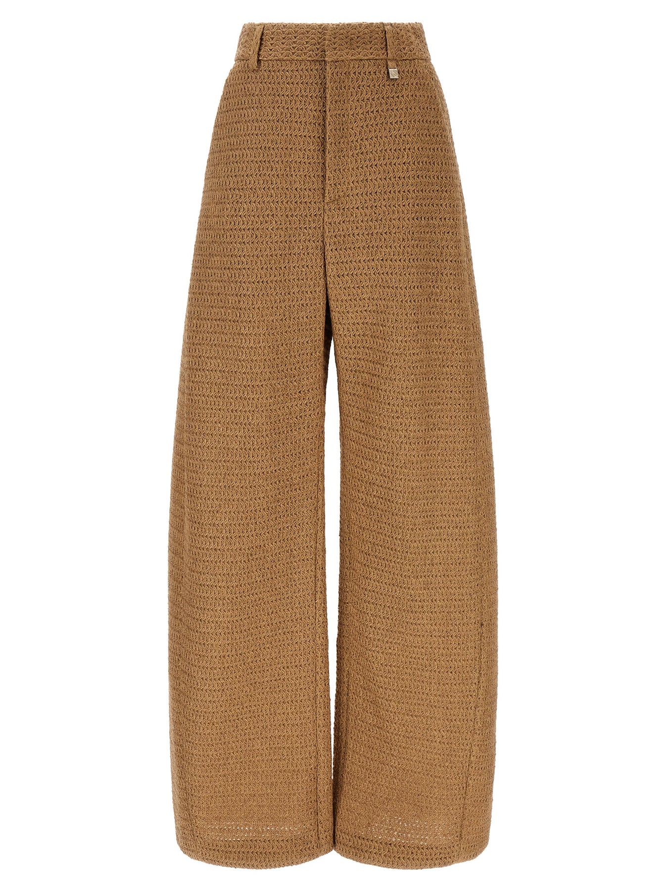 Braided raffia-effect fabric trousers, tailored model, wide leg, hook and front button zip closure, pockets, tone-on-tone semi-transparent organza lining. Handcrafted product, any imperfections are to be considered characteristics of uniqueness.