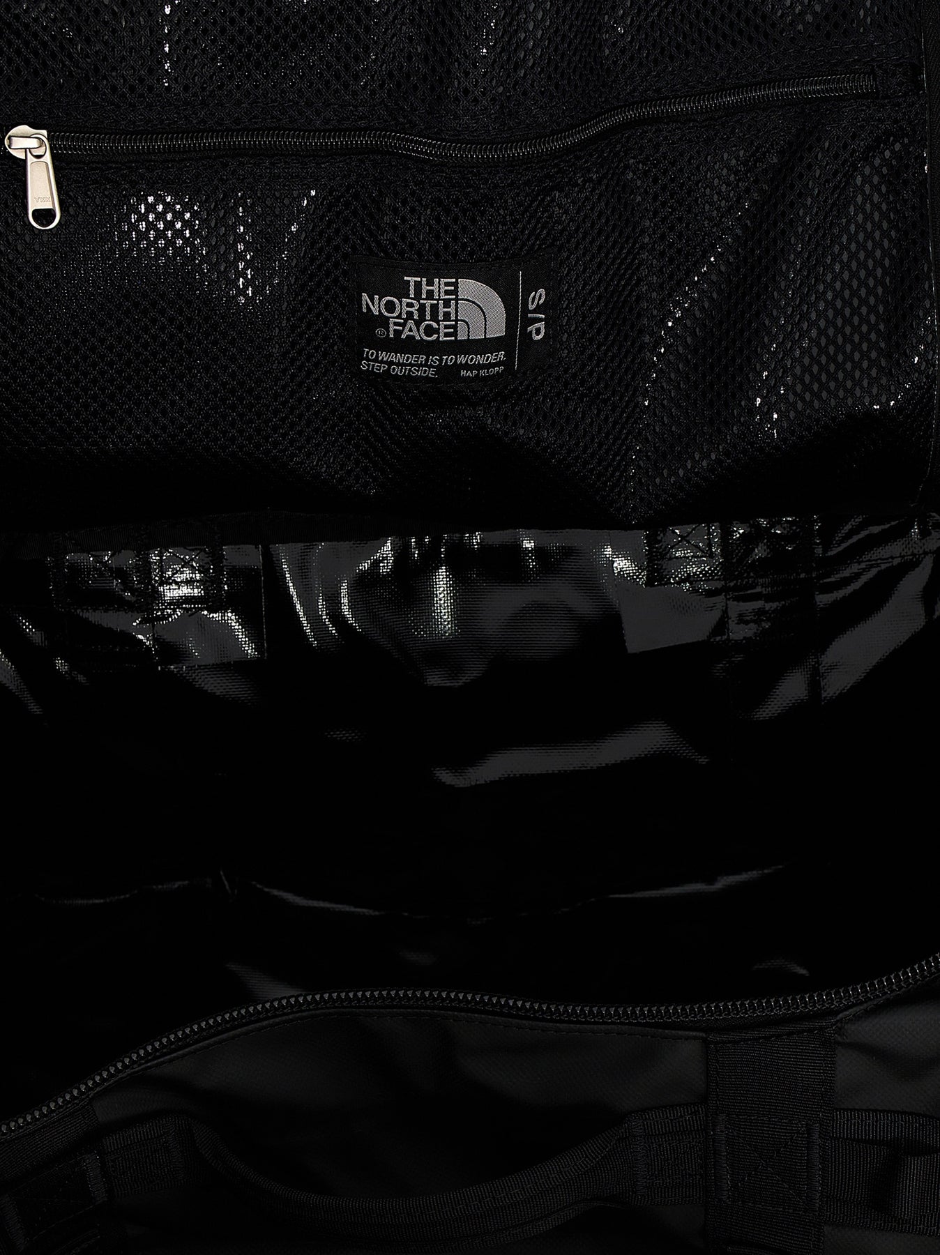 'Base Camp Duffel S' water-resistant Base Camp technical fabric duffel bag, zip closure, adjustable and removable shoulder straps, two padded side handles, D-opening with zip and flap, main compartment with mesh pocket closed by zip and pocket on the end, four compression straps, transparent document pocket on the top. Mesh bag to carry or store your duffel bag. SUSTAINABLE: product made from recycled materials.