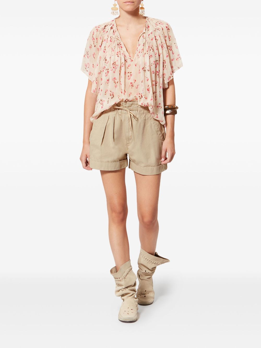 beige drawstring fastening pleated elasticated waistband rolled hem rear patch pockets