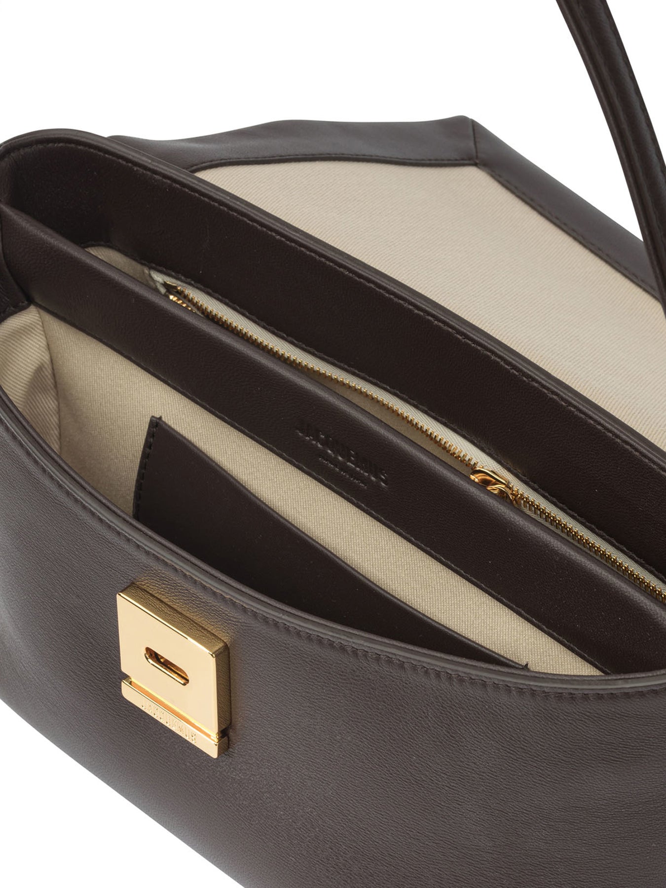Jacquemus "Rond Carré" shoulder bag, made of soft nappa leather with a compact rigid structure and essential silhouette. The design incorporates a top handle and a fold-over flap with magnetic closure. The main body incorporates smooth metal inserts secured with gold-plated hardware, while the Jacquemus logo is applied in metal on the front. All interior surfaces are lined with cotton. || - Fine-grained nappa leather with a smooth surface - Textured top handle - Flap with fold-over magnetic closure - Gold-plated ball and cube charm - Back patch pocket - Interior patch pocket - Inside zipper pocket - Gold-plated metal trim and logo - Inside cotton lining - Handle width designed for shoulder use