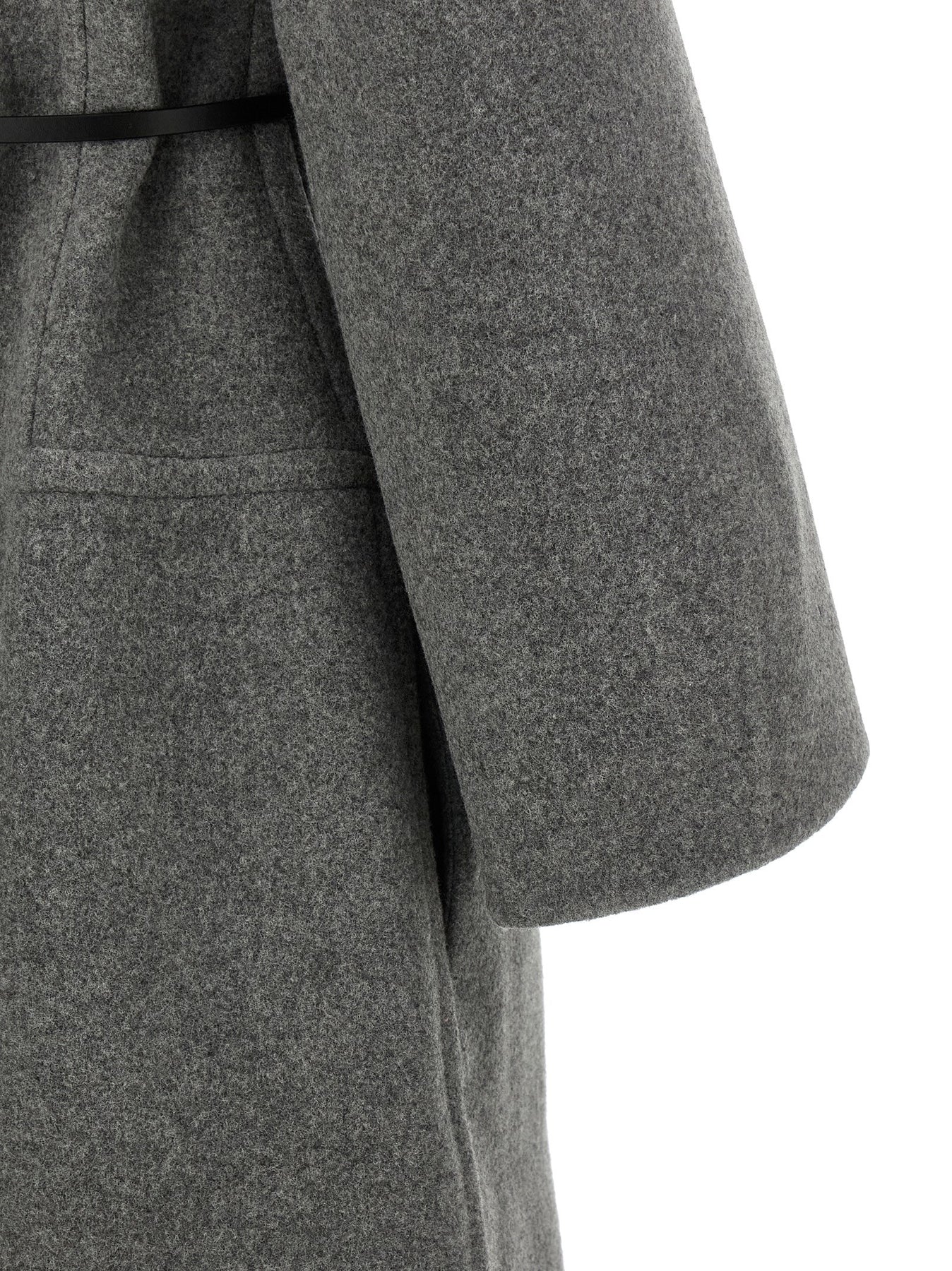 02' single-breasted structured coat in virgin wool felt with front button closure, pockets, wide long sleeves with dropped shoulders, back slit, and removable leather belt.