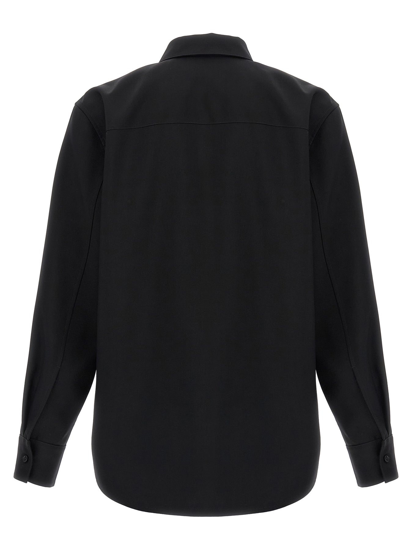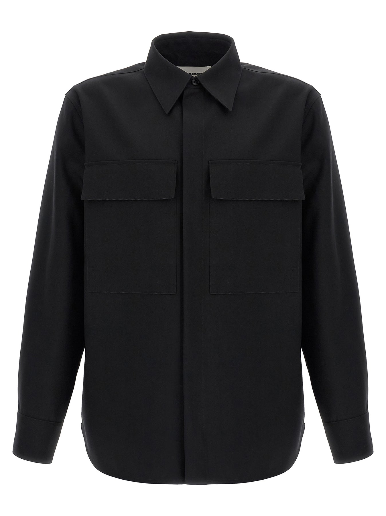 '08' wool shirt with front button closure, pockets, long cuffed sleeves.