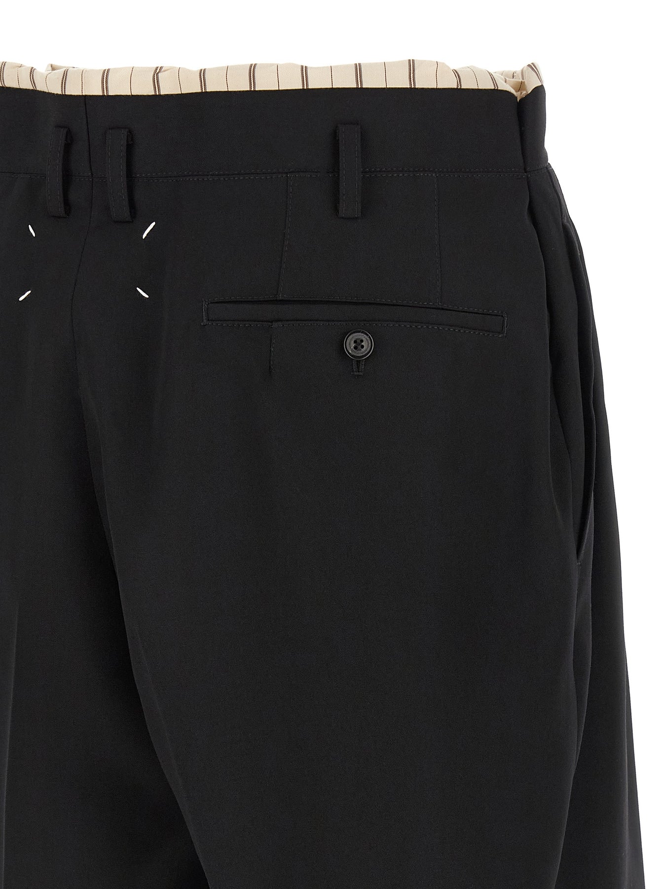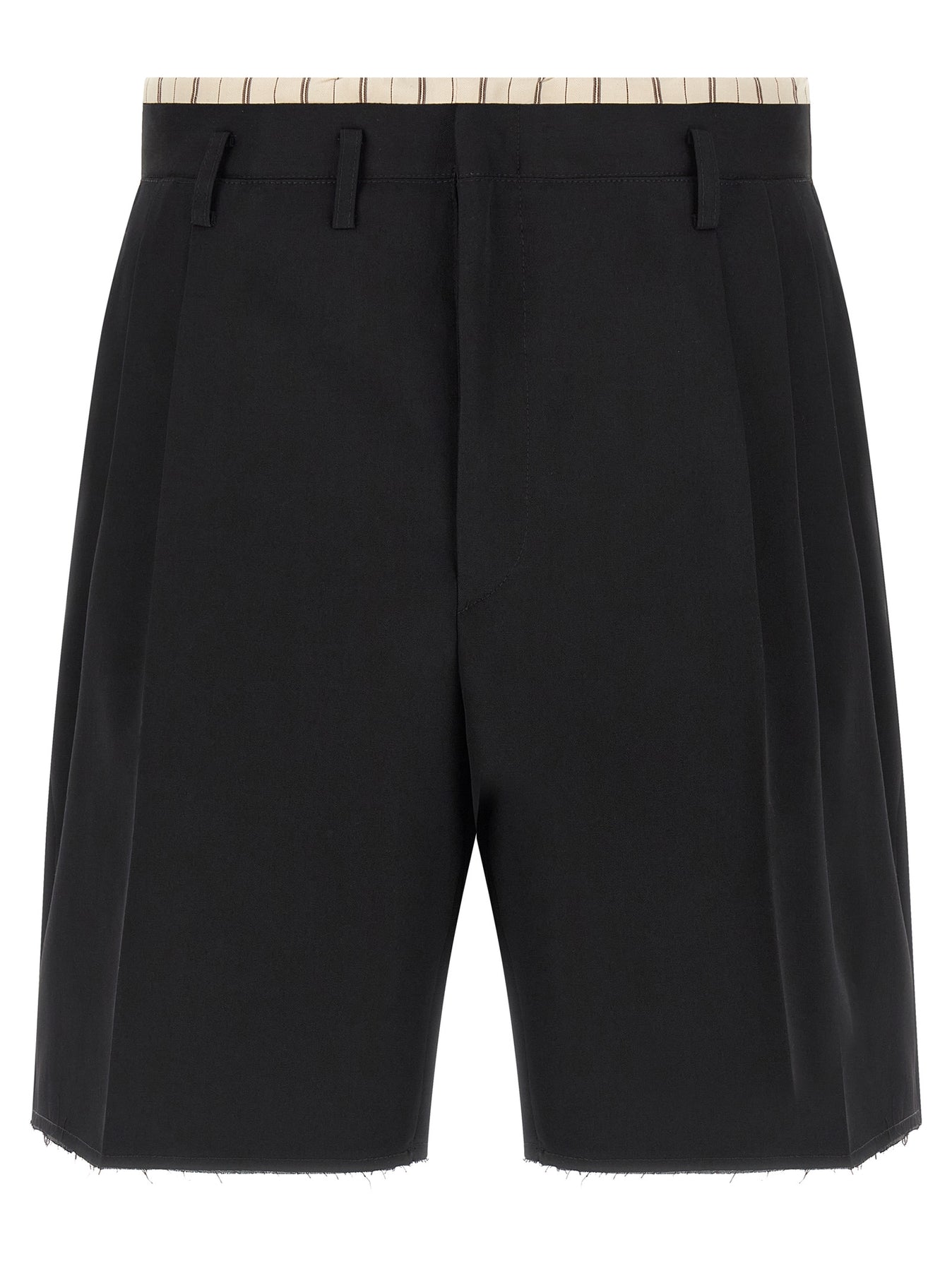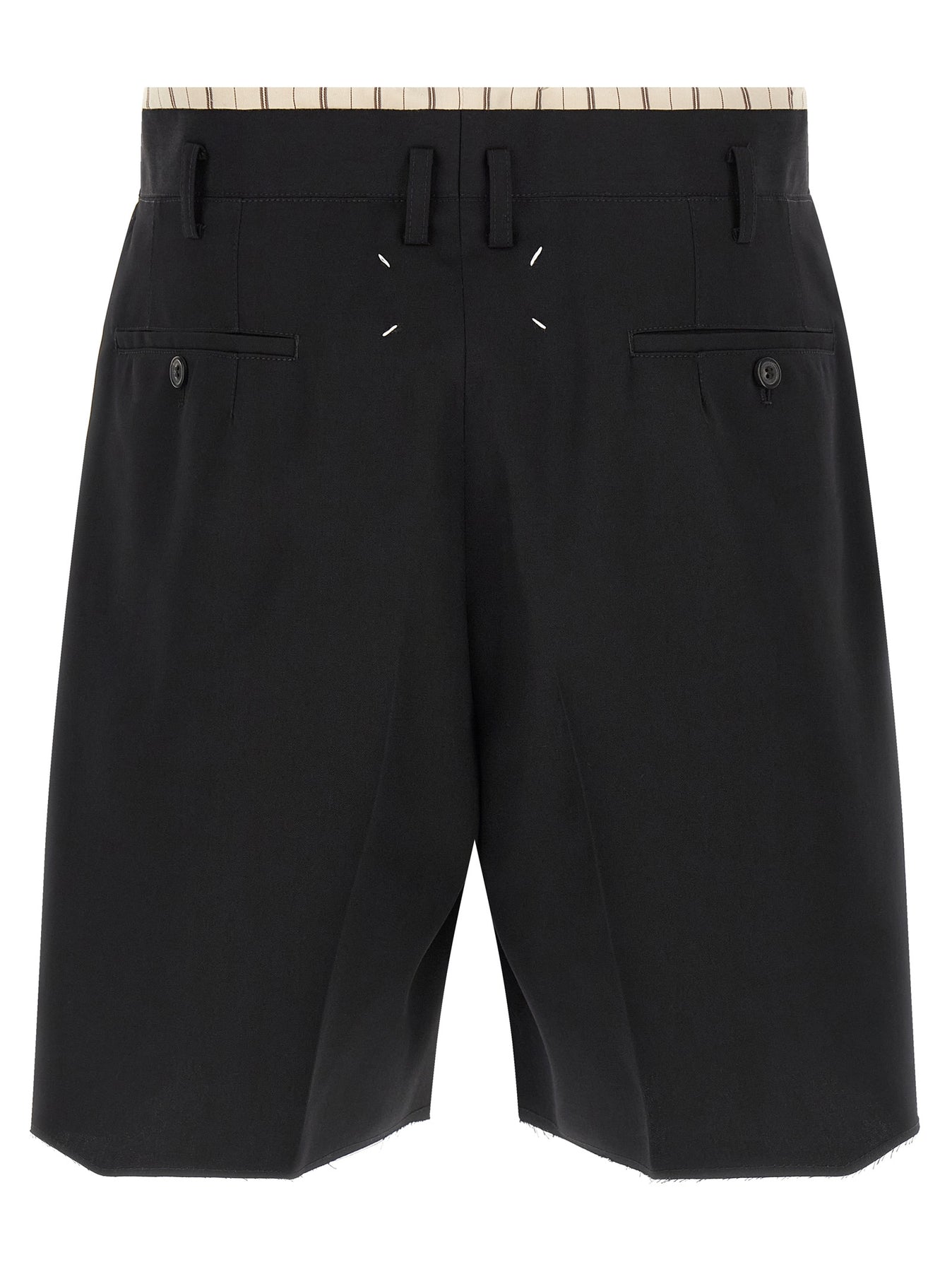 Wool bermuda shorts, striped cotton lining insert visible at the waist, stretched pleat, front and side pincers, hook and button zip closure, pockets, raw cut hem, 'Four Stitches' at the back.