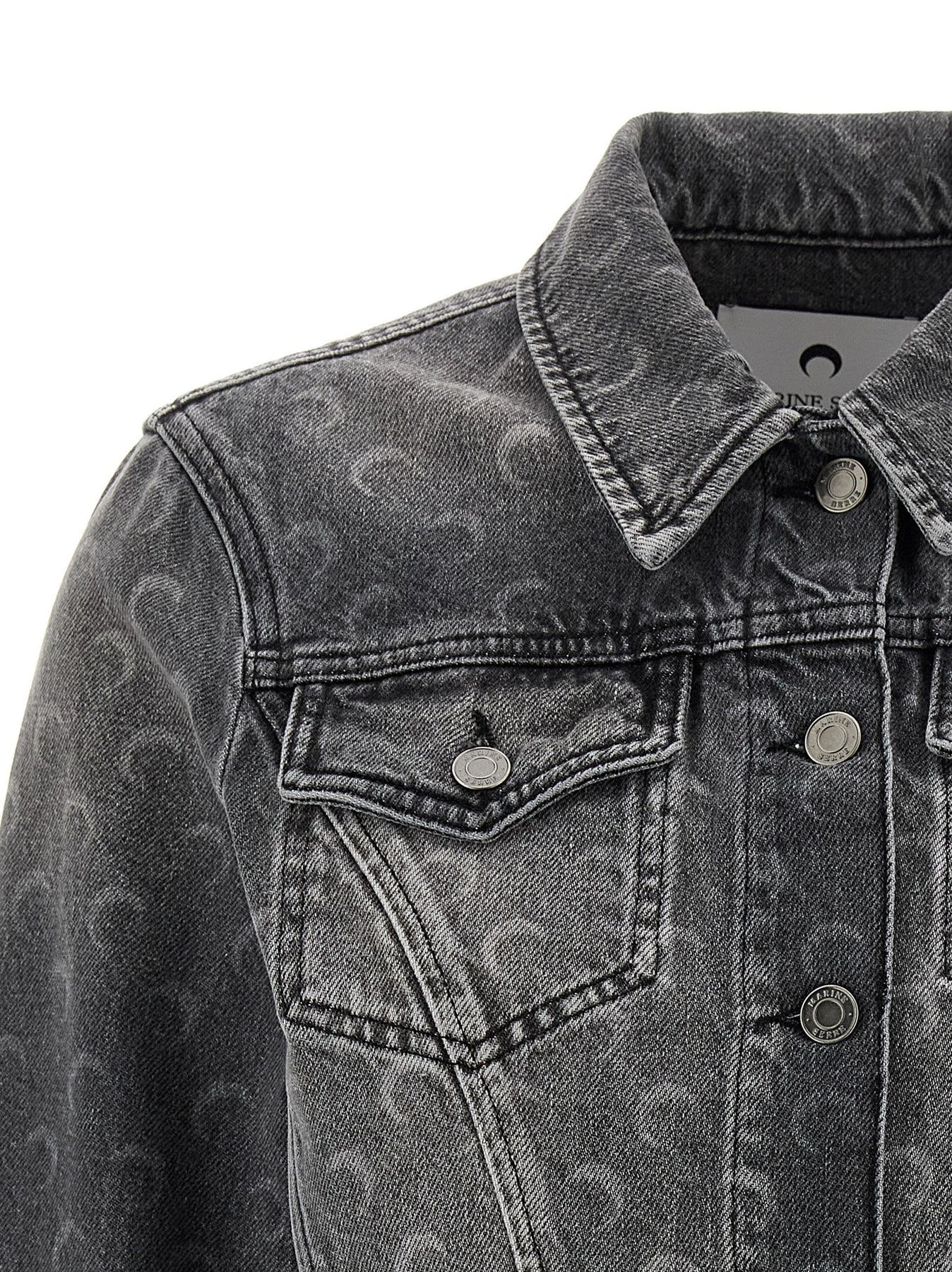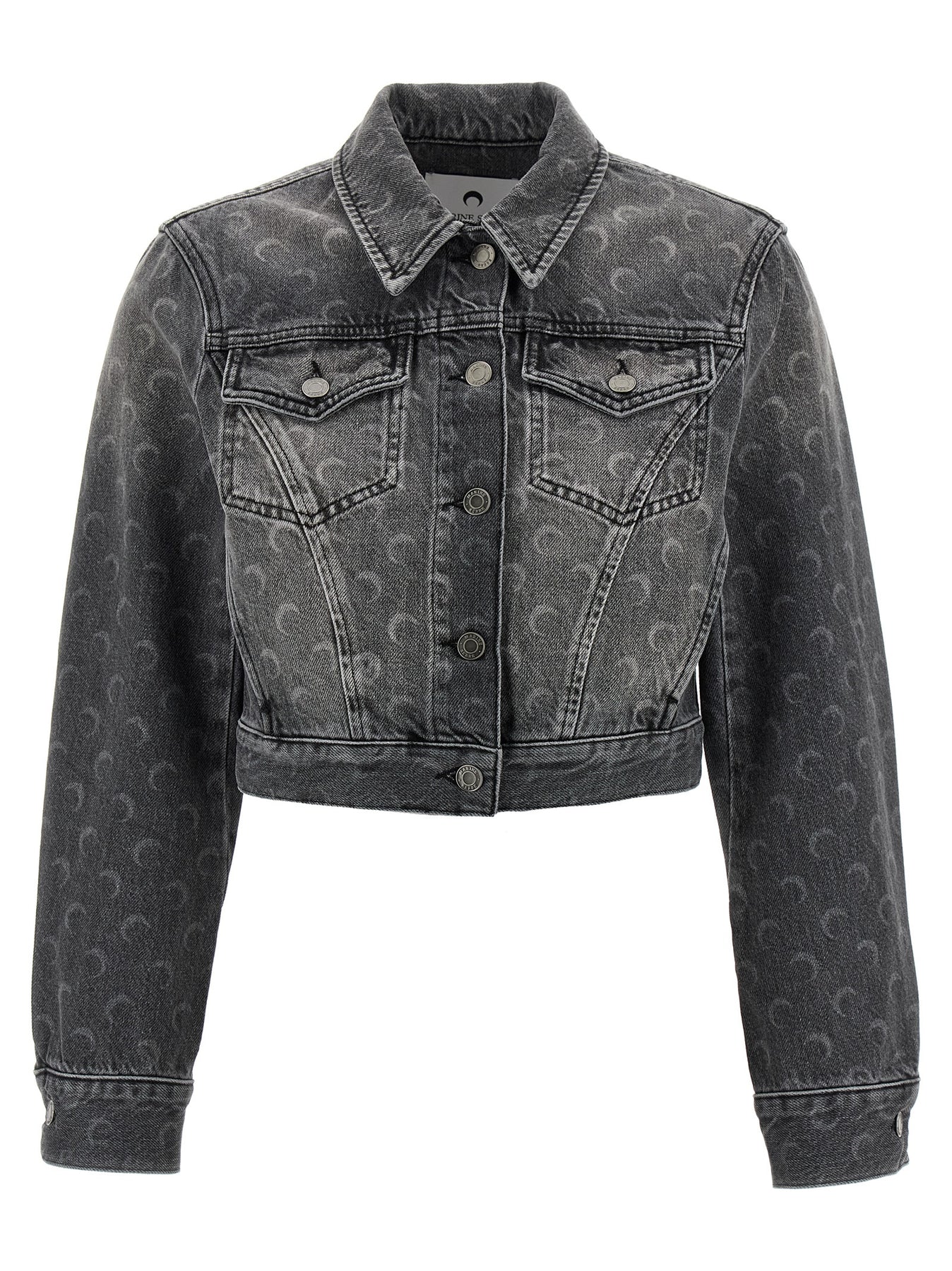 All-over laser 'Moon' print cotton denim jacket, crop style, shirt collar, front button closure, pockets, long cuffed sleeves, leather logo patch at the back.