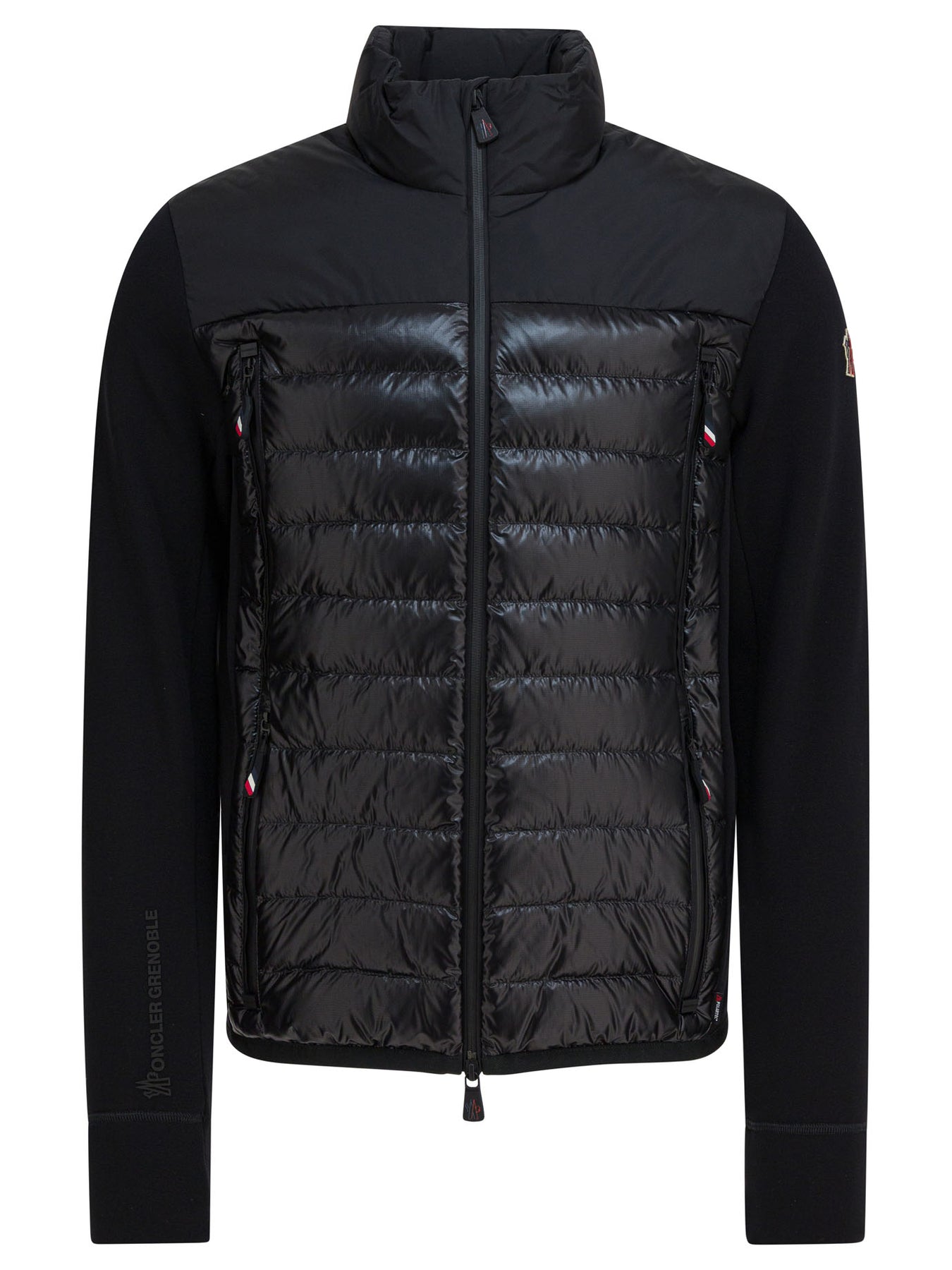 Lightweight down jacket with Moncler Grenoble logo, featuring hybrid structure with padded front panels and plush back. The model features plush sleeves and interior, clean edges and straight silhouette. Full-zip front closure, zippered side pockets and defined functional details. Synthetic padding is applied only in the front, while the fabric used ensures lightness and protection. || - Moncler Grenoble logo applied - Plush sleeves - Plush interior - Zipper closure - Side pockets with zipper - Padding on front only - Plush back - Regular fit