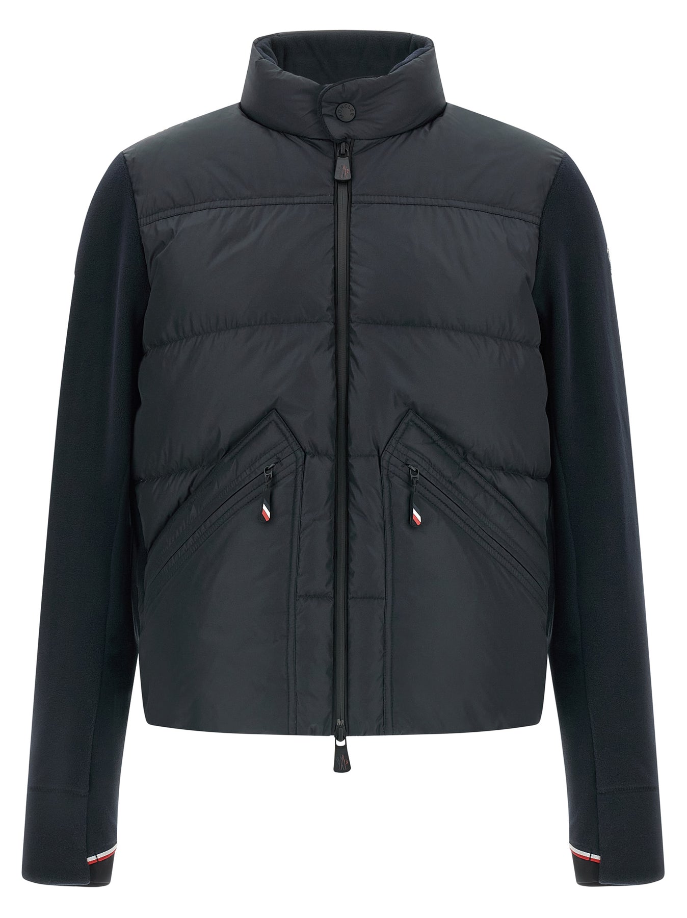 Fleece-effect stretch jersey cardigan with rainwear front with goose down padding, micro ripstop lining, standing collar with snap button closure, front zip closure, pockets, long cuffed sleeves and logo patch appliqué.