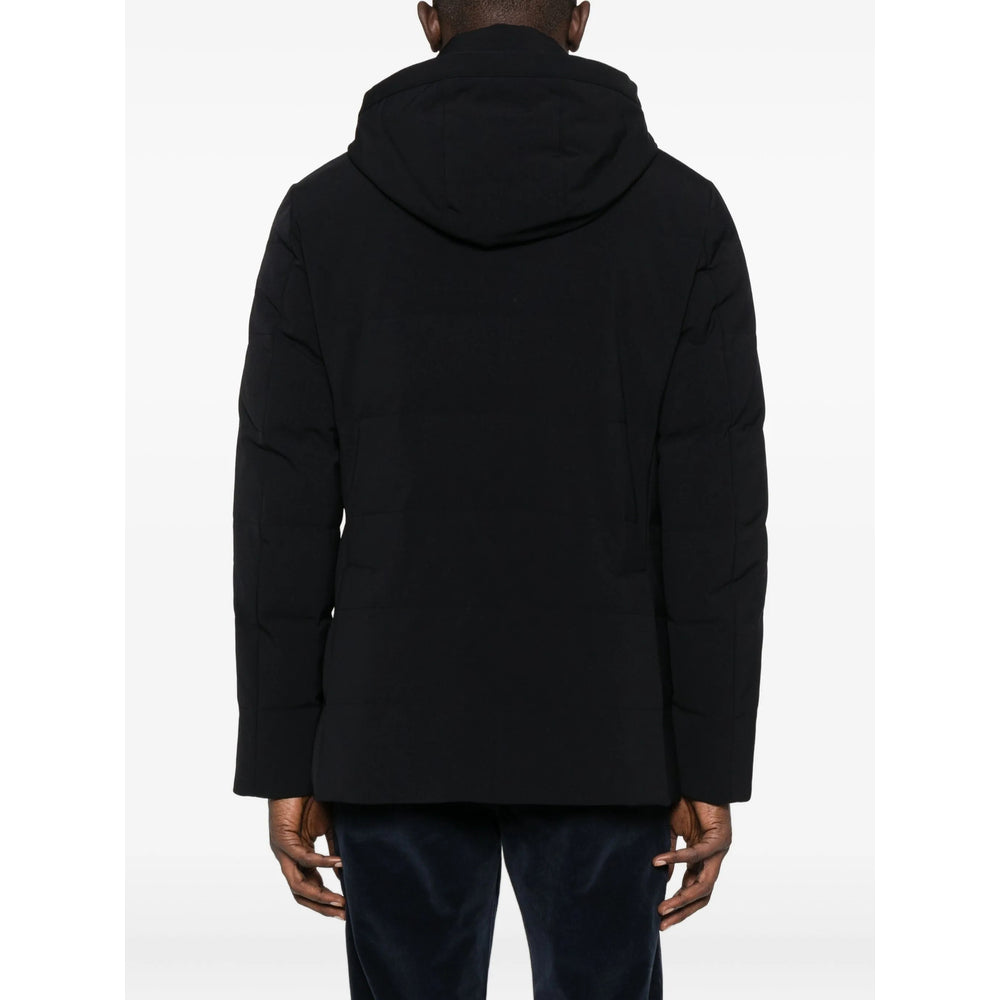 black hooded neckline layered design front zip fastening front button closure long sleeves straight hemline
