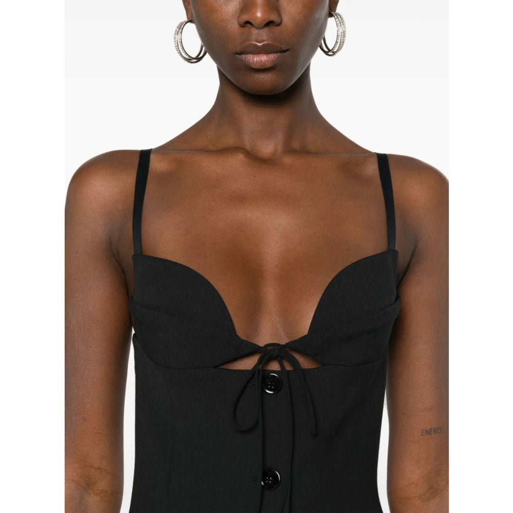black adjustable spaghetti straps sweetheart neck sleeveless front tie fastening to the chest cut-out detailing to the front two front jetted pockets thigh-length full lining straight hem front button fastening