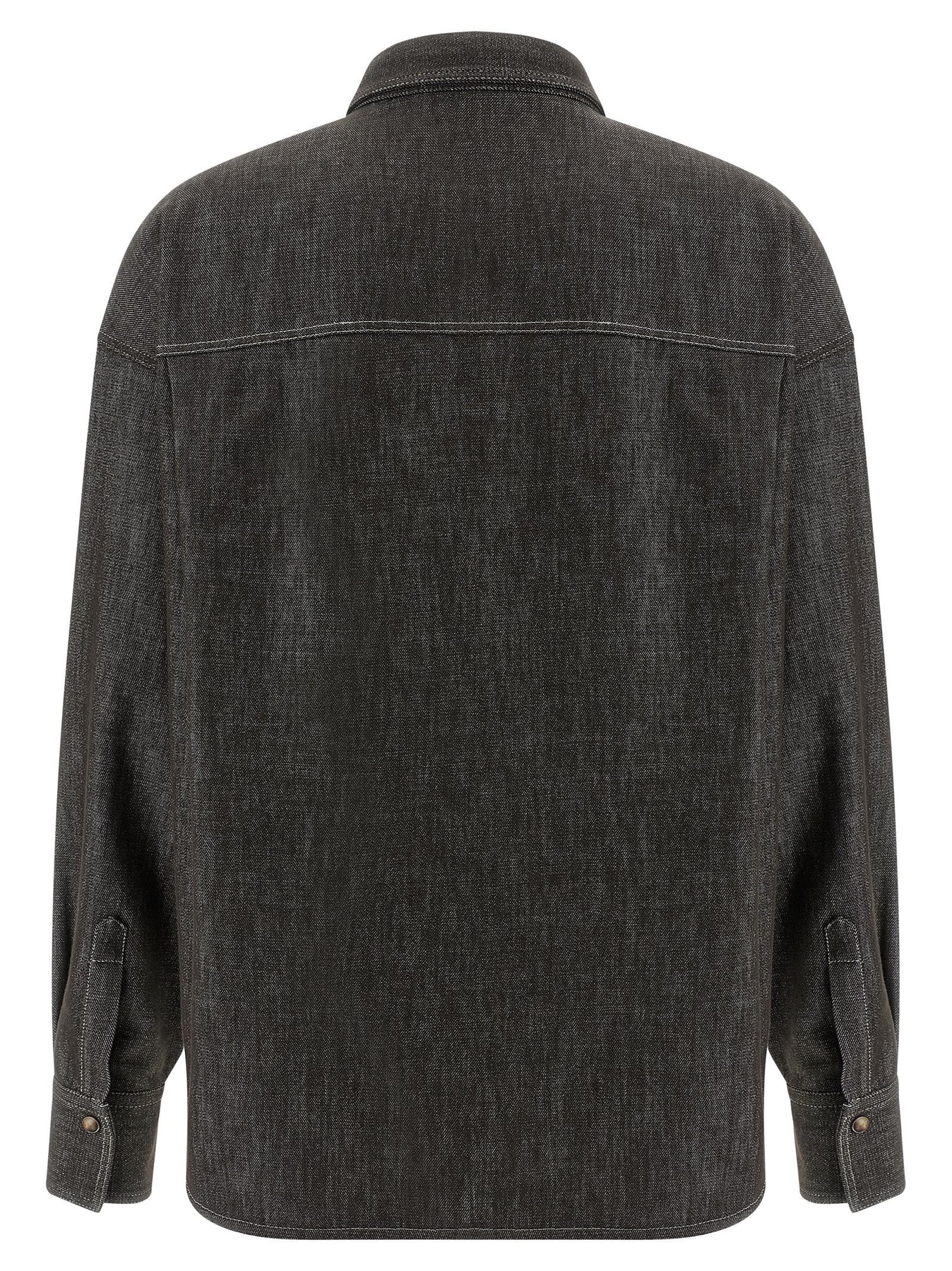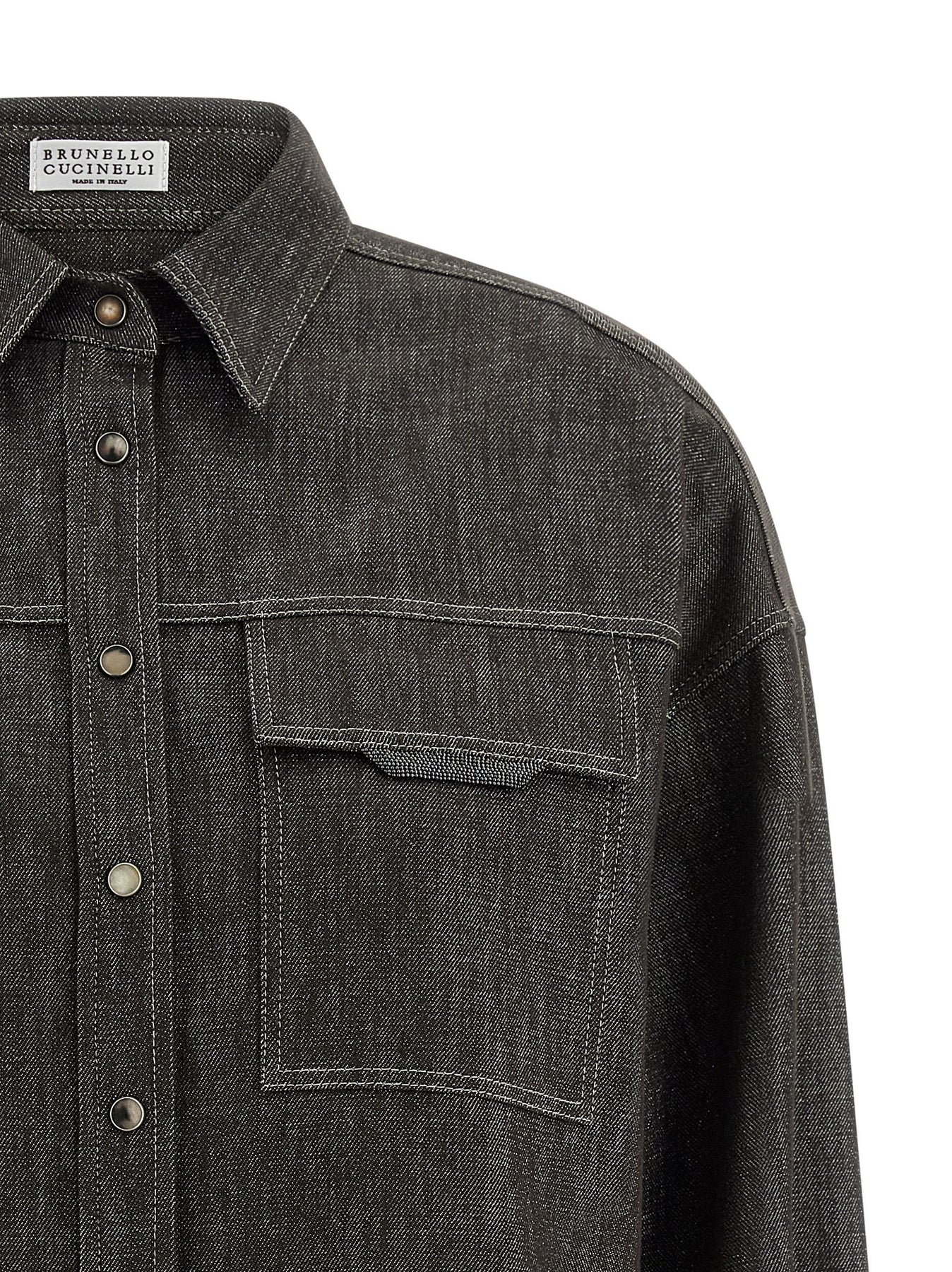 Sparkling no fade denim shirt in cotton and viscose blend with lamé thread, contrast stitching, front snap button closure, breast pocket with Monile 'Shiny Flap Detail', long sleeves with cuffs and dropped shoulders, side slits, and asymmetric hem.