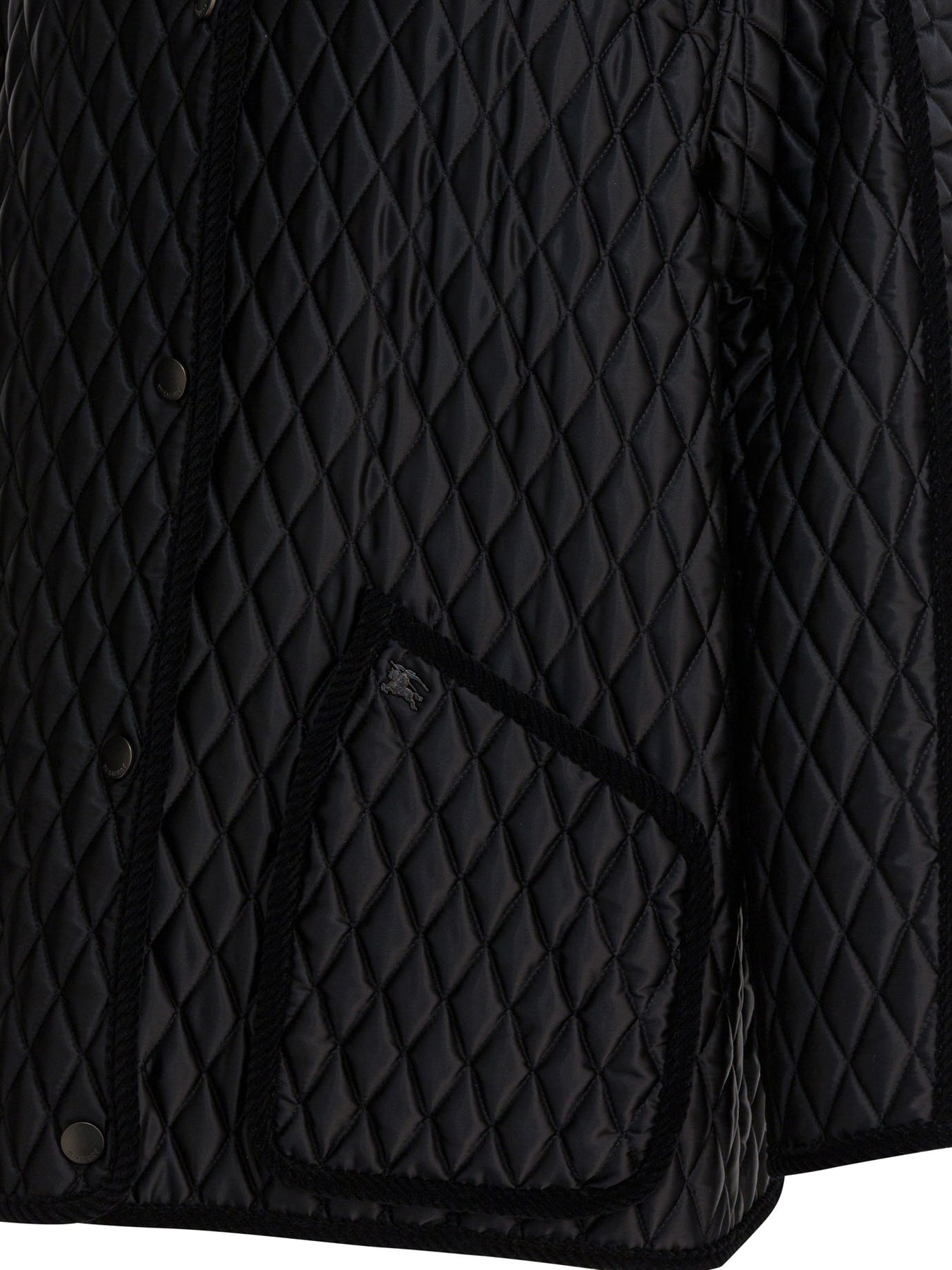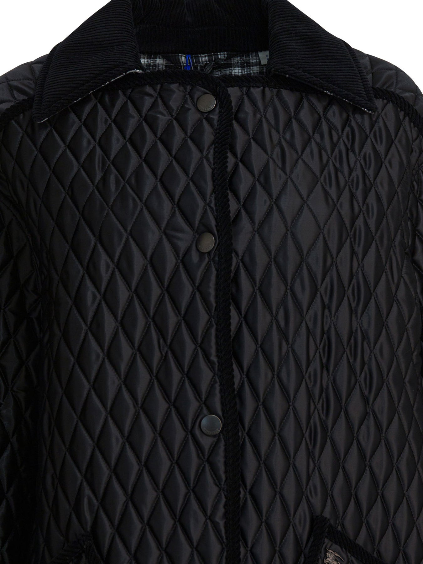 Burberry "Floriston" quilted jacket constructed of shiny nylon with contrasting corduroy trim. The construction highlights a boxy silhouette and regular quilting. Raglan sleeves ensure a comfortable fit. Functional elements include snap-button closure, front patch pockets and back slits that can be adjusted by snap buttons. The front pocket features a metallic element with the Equestrian Knight motif. || - Solid color - Shiny nylon - Contrasting corduroy trim - Regular quilting - Raglan sleeves - Snap button closure - Front patch pockets - Back slits with snap buttons - Equestrian Knight Metallic design on the pocket - Cotton lining - Relaxed fit