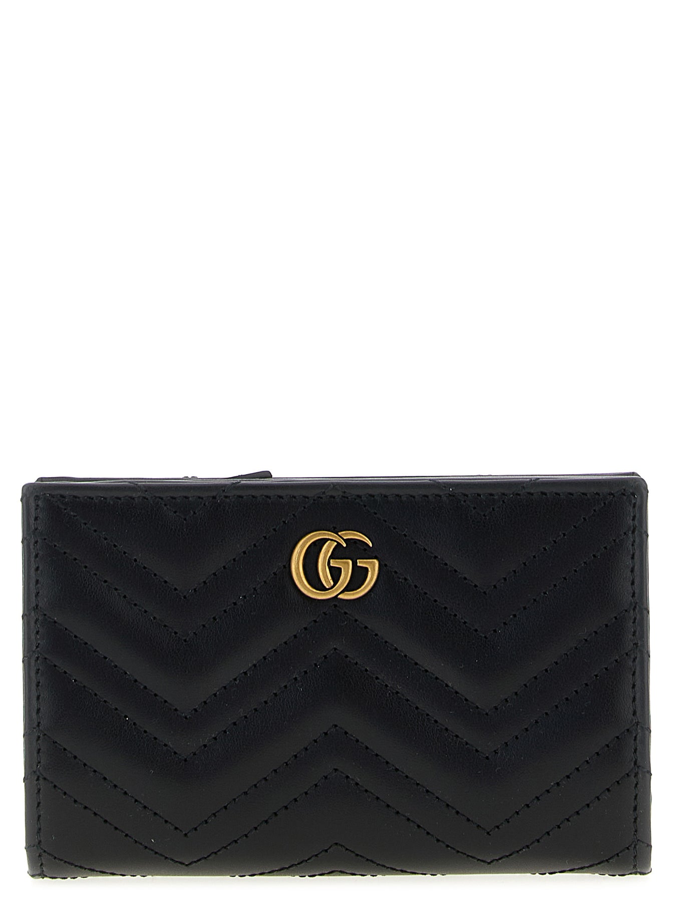 'GG Marmont' wallet in matelassé leather with chevron pattern, moiré lining, antiqued double G detail on the front, snap button closure, zip pocket.