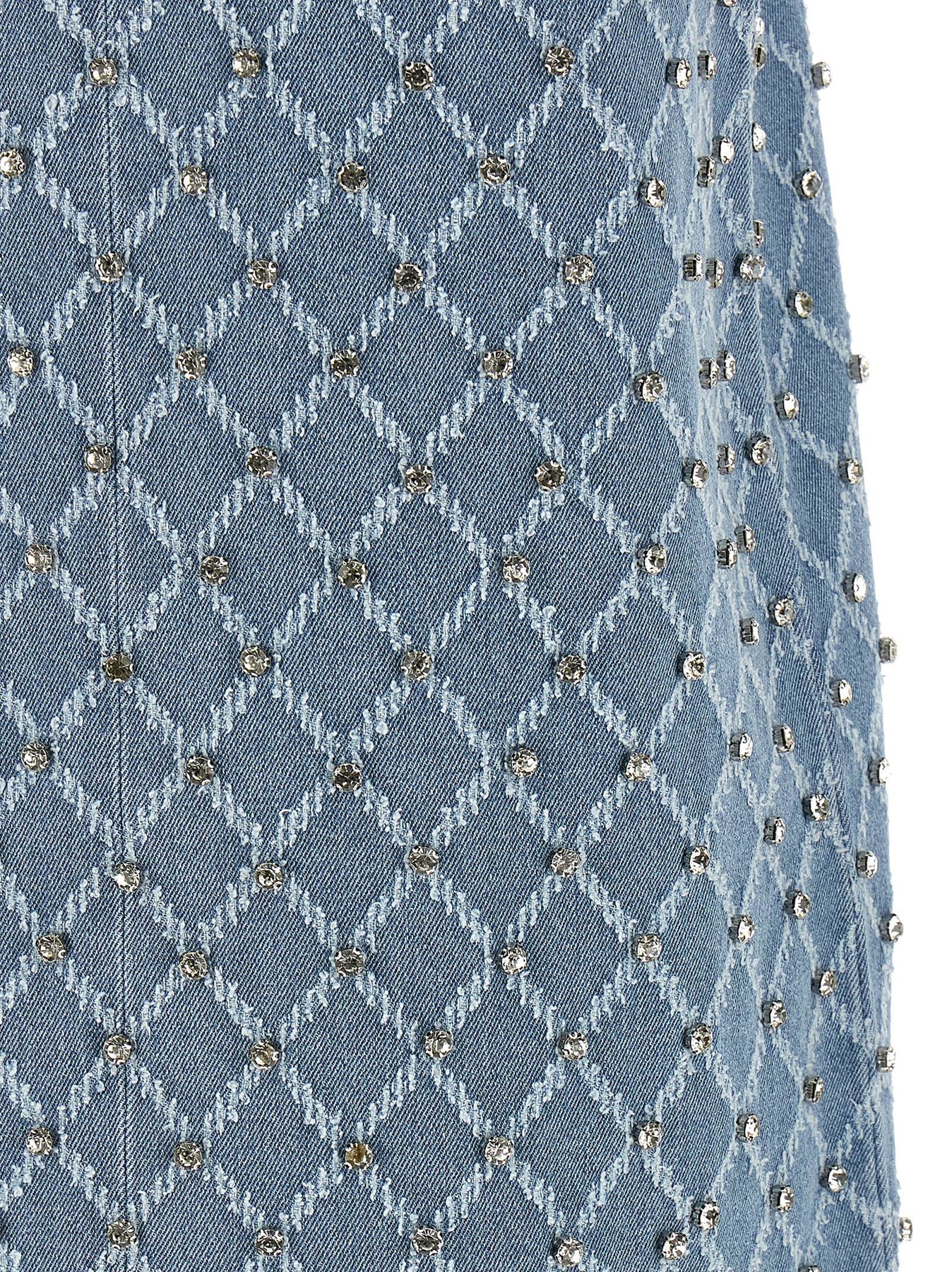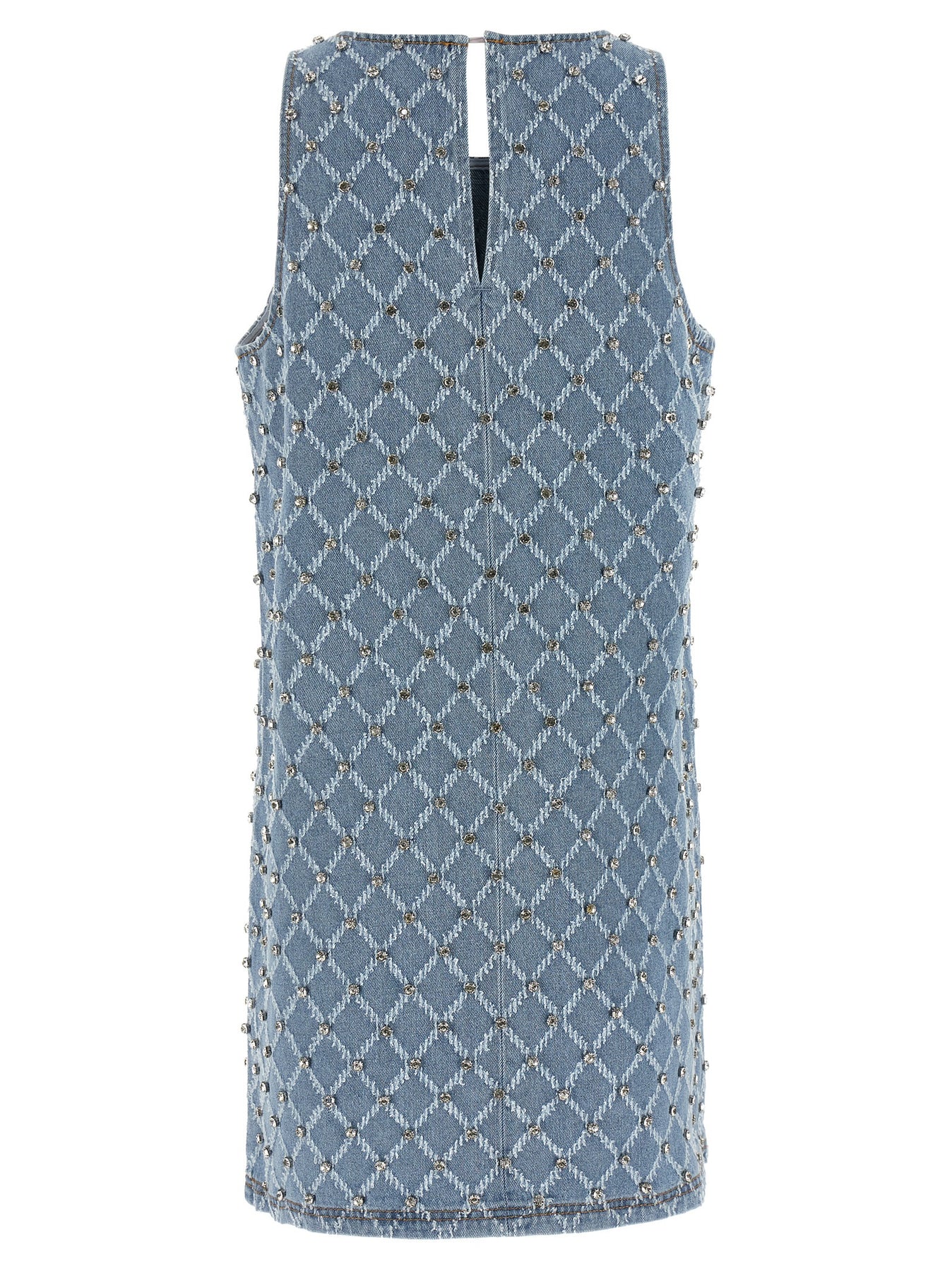 'Amorino' cotton denim mini dress with jacquard diamond pattern and all-over crystal appliqué, contrast stitching, crew neck with back button closure and teardrop cut-out detail, sleeveless, unlined.