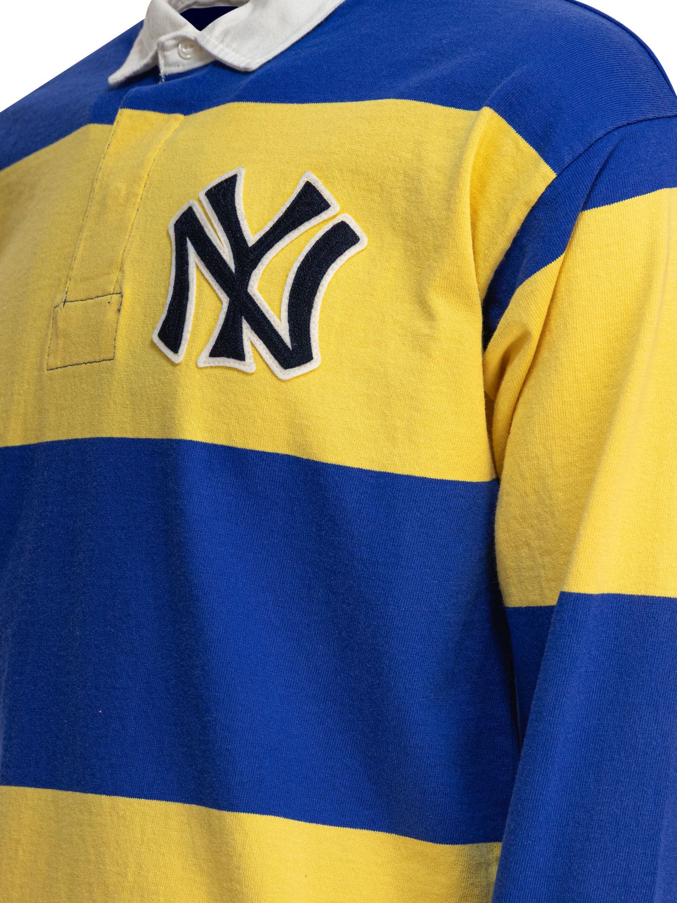 Polo Ralph Lauren's rugby polo shirt embodies the sporty and nostalgic spirit of baseball, recalling Ralph Lauren's youthful love for the Bronx Bombers™. Made of soft cotton jersey, this rugby jersey captures the essence of an era, presenting details that pay homage to the New York Yankees™. The presence of the embroidered pony, the brand's distinctive emblem, blends harmoniously with the appliqués that form the words "New York," creating a unique synergy between past and present. || - Striped - Long sleeves - Made of cotton jersey - New York Yankees™ logo applique. - Embroidered pony - Environmentally sustainable product - Relaxed fit