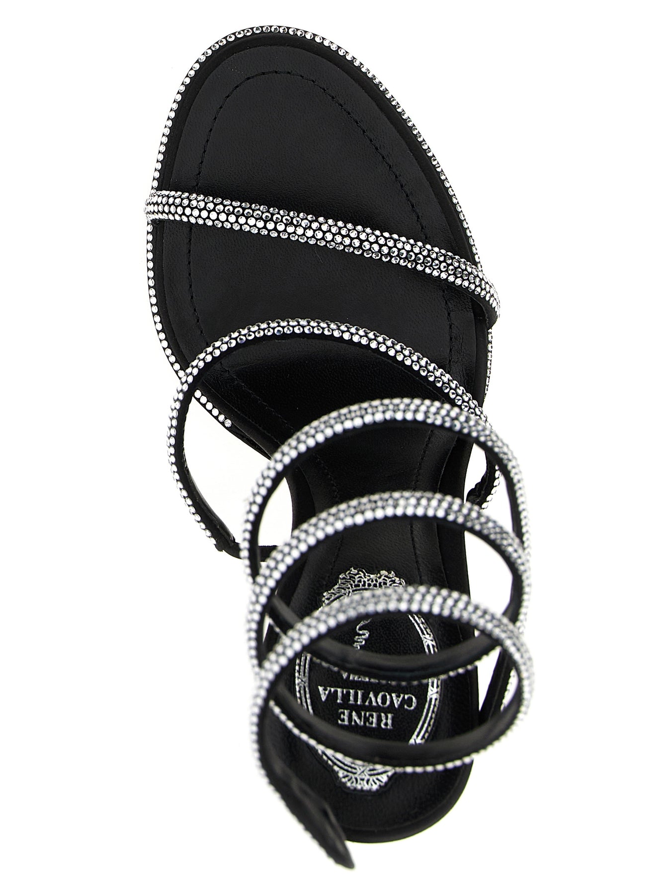 'Cleo' satin sandals with all-over rhinestone appliqué, band wrapping around the ankle, heel, stardust sole.