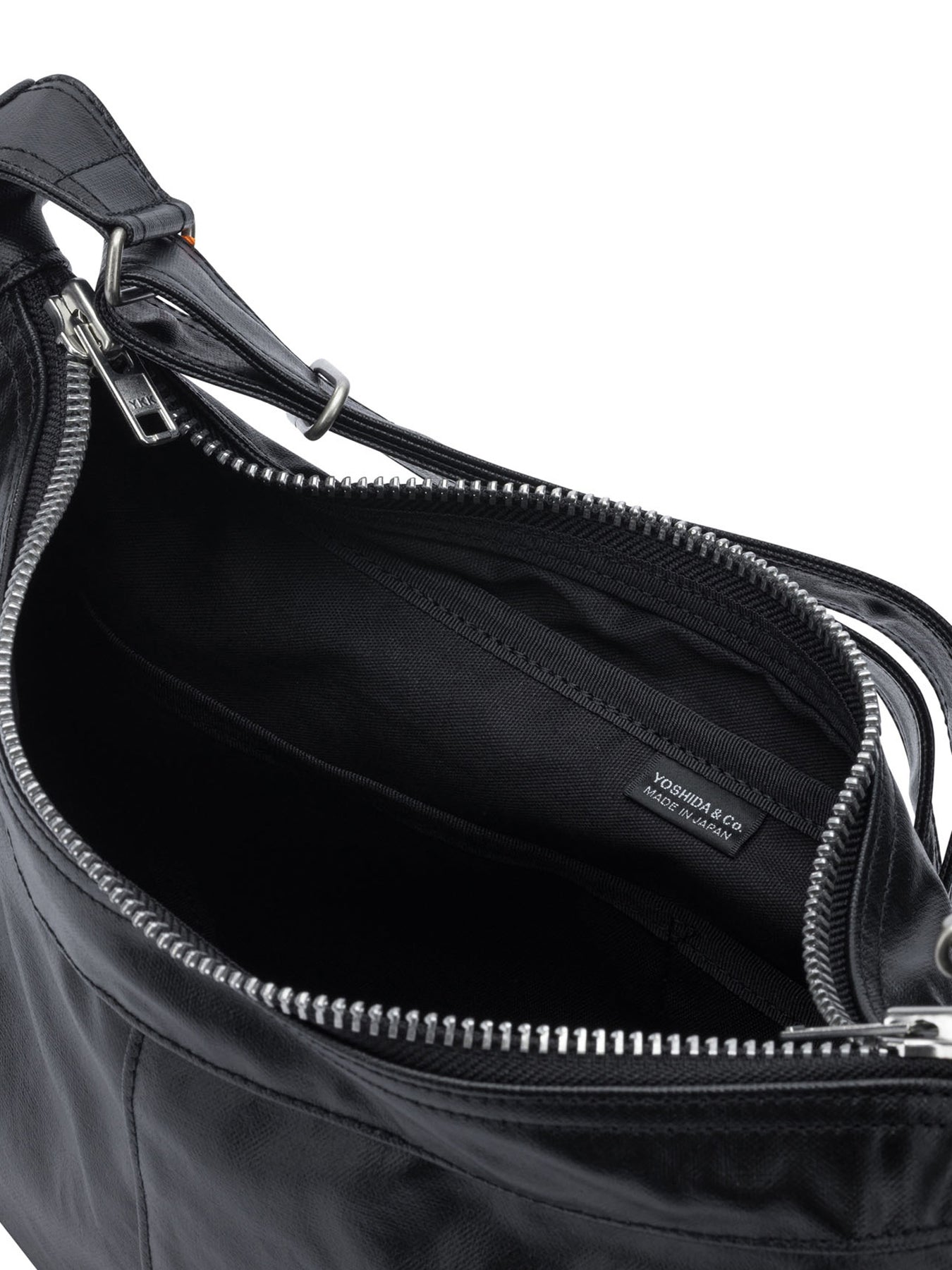 Porter-Yoshida & Co "Free Style" schoulder bag, made of a No. 10 tightly woven canvas structure. The main material is a fabric worked by curling polyurethane over the surface of the cotton base. The process of dyeing, shrinking and subsequent abrasion gives the fabric an irregular grain and texture reminiscent of leather. The profile is defined, with functional compartments and an integrated zipper closure. || - Main fabric: cotton with curly polyurethane surface finish - Surface texture characterized by slight pleats - Top zipper closure - Adjustable shoulder strap - Soft structure with compact silhouette
