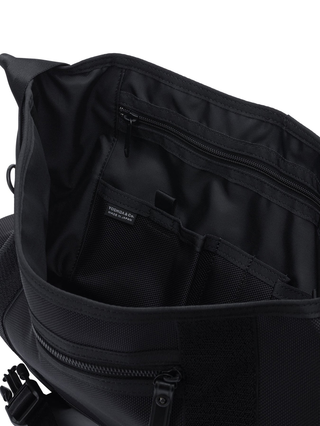 Porter-Yoshida & Co "Heat" crossbody bag made predominantly of varistor nylon woven with nylon 66 thread. The structure features a three-dimensional silhouette that holds its shape and resists deformation thanks to the thick, high-density nylon webbing used at key points. The main body combines materials with different textures, including highly waterproof tarp fabric, accented by military-inspired functional details. || - Varistor nylon woven with nylon 66 with high heat, abrasion and tear resistance - Fabric details with waterproof properties - PALS attachment system for modular attachment of accessories and additional pockets - Presence of D-ring and double loop for carabiner or wallet chain - Structure reinforced with high-density nylon tape at strategic points - Top zipper closure