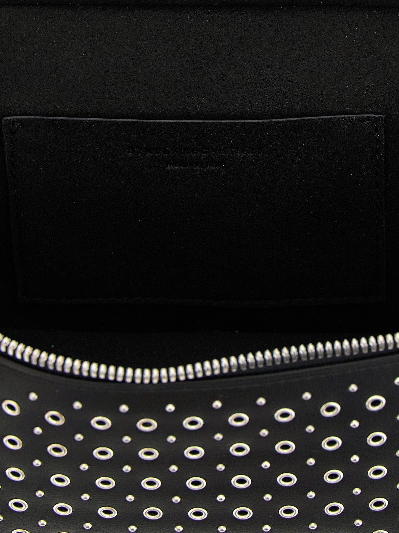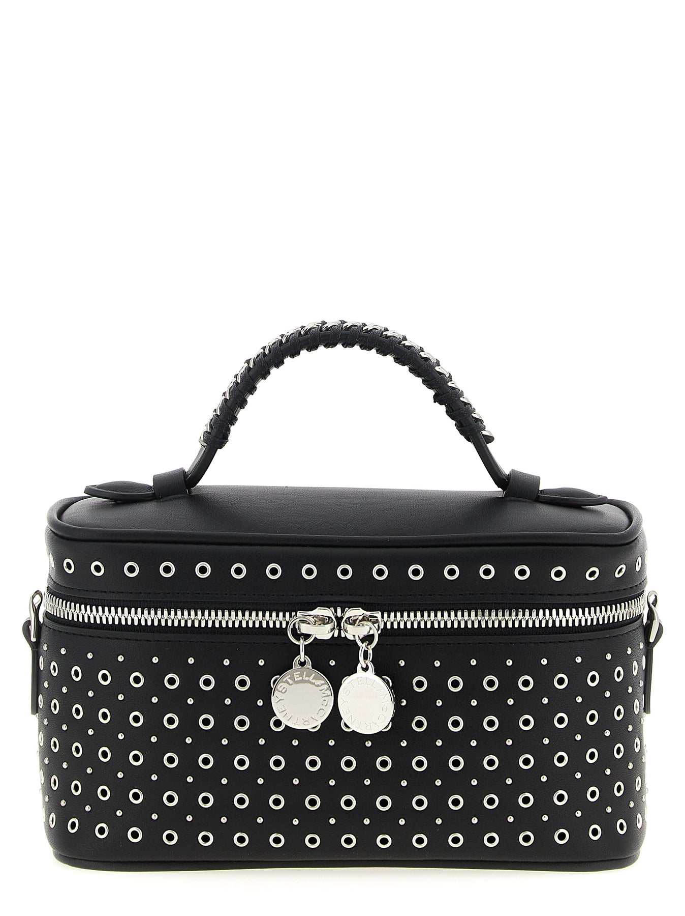 'Vanity Falabella' crossbody bag in leather-effect fabric with all-over studs, fixed handle, zip closure, removable chain shoulder strap. SUSTAINABLE: Products that do not use leather respecting cruelty free ethics.