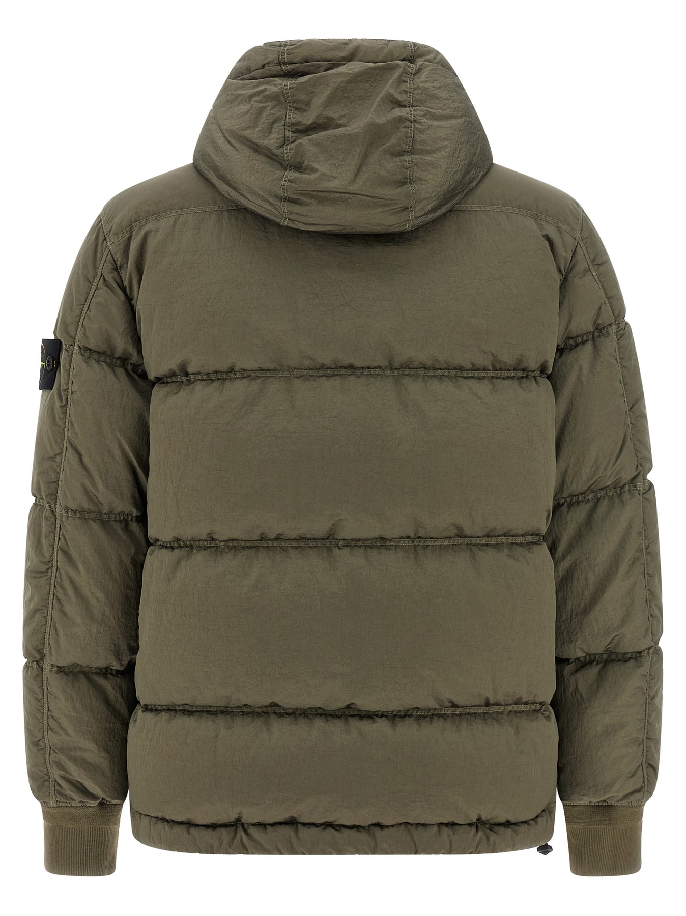 Quilted iridescent Nylon Metal quilted down jacket with goose feather padding, adjustable hood, front zip closure, pockets, long sleeves with knitted cuffs and logo badge appliqué, drawstring on the hem. SUSTAINABLE: This product is made of ECONYL regenerated nylon.®