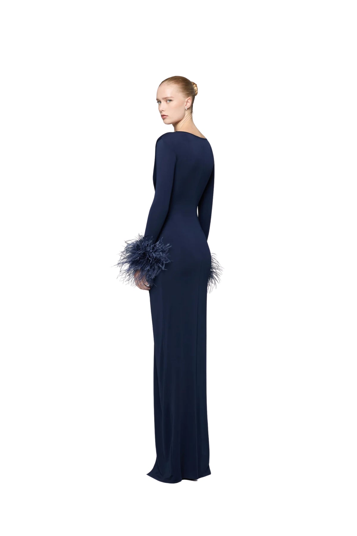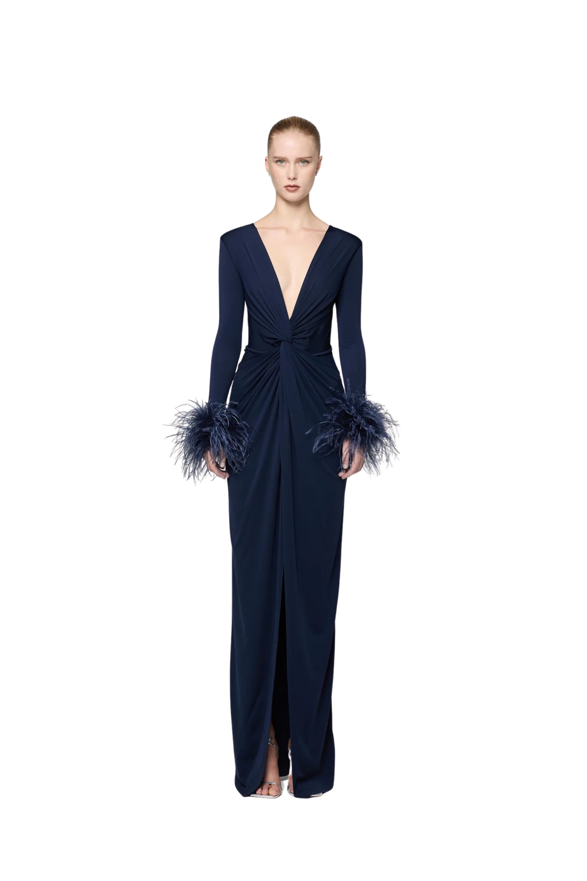 The Archivia Amber Ares dress in blue. Featuring long sleeves, a deep V-neckline, and a front slit. Accentuated with removable blue-colored feathers.