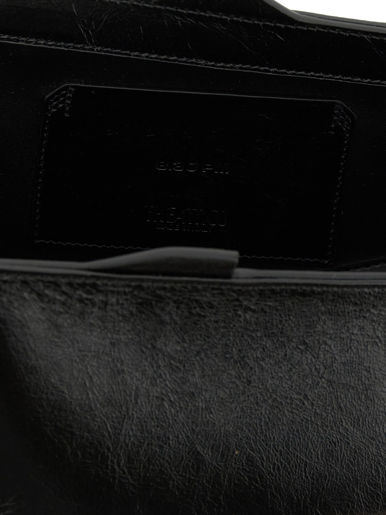 Oversize '8.30 PM' crackled leather clutch with magnetic closure, rigid base with metal logo feet.