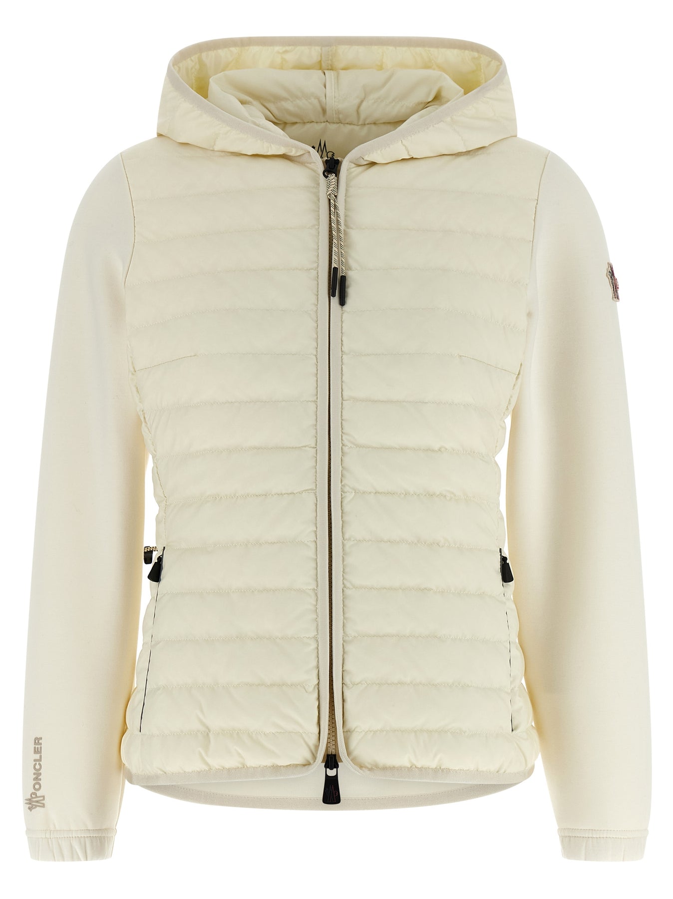 Hoodie in polyester and viscose blend doubled fabric with quilted and slightly padded goose down front saison longue part, front zip closure, pockets, long sleeves with elastic cuffs and logo patch appliqué, and back drawstring at the waist.