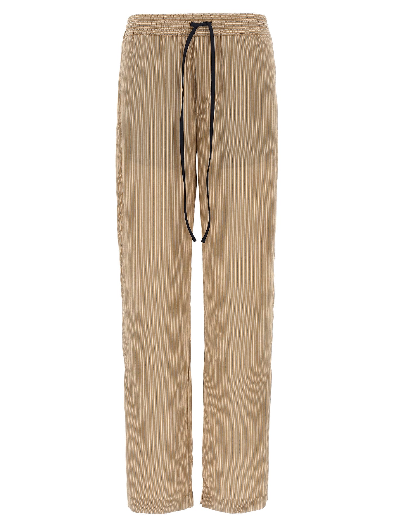'Pleat Detail Pyjama' striped viscose and silk blend trousers, adjustable drawstring elastic at the waist, pockets, wide leg, gusset at the bottom of the leg.