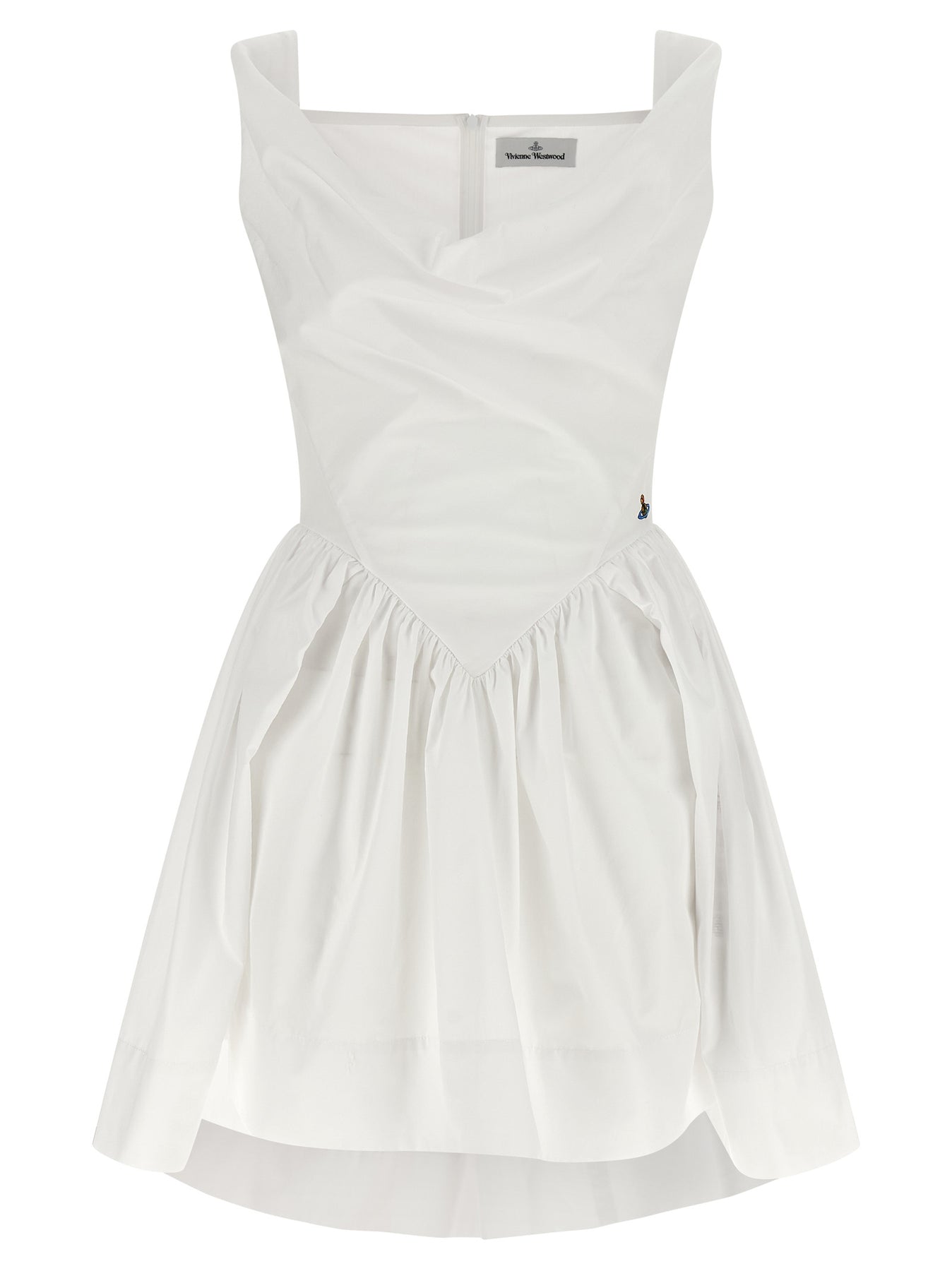 'Sunday' cotton minidress with corset corset, wide round neckline with draping, thick shoulder straps, sleeveless, back zip closure, front logo embroidery, full skirt with pincers and curls.