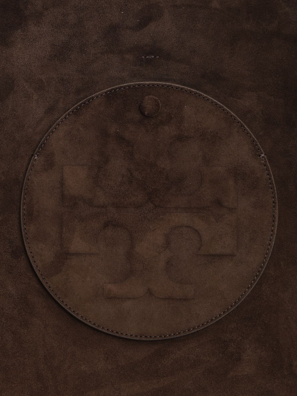 Tory Burch "Ella" suede tote bag with oversized logo patch on the front and leather handles