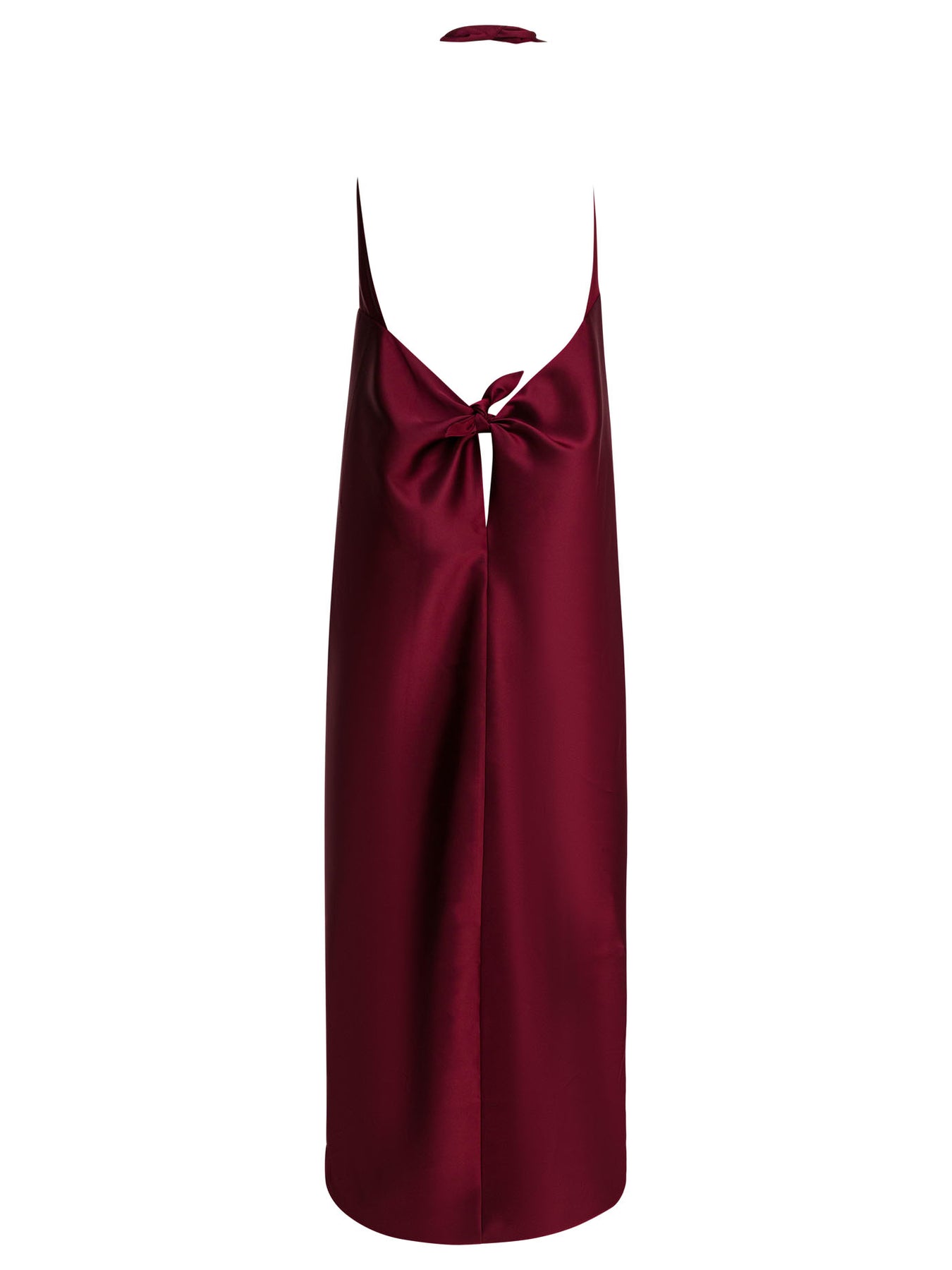 Semper's American neckline flared dress, made of satin-effect fabric, features a long, flowing silhouette. The sleeveless construction enhances the American neckline construction, while the back remains uncovered. The main material is polyester, selected to give smooth surface and soft fall. The flared cut defines the shape, promoting ample movement of the garment. || - Solid color - Flared dress - Sleeveless - Satin-effect fabric - American neckline - Open back - Long length - Regular fit
