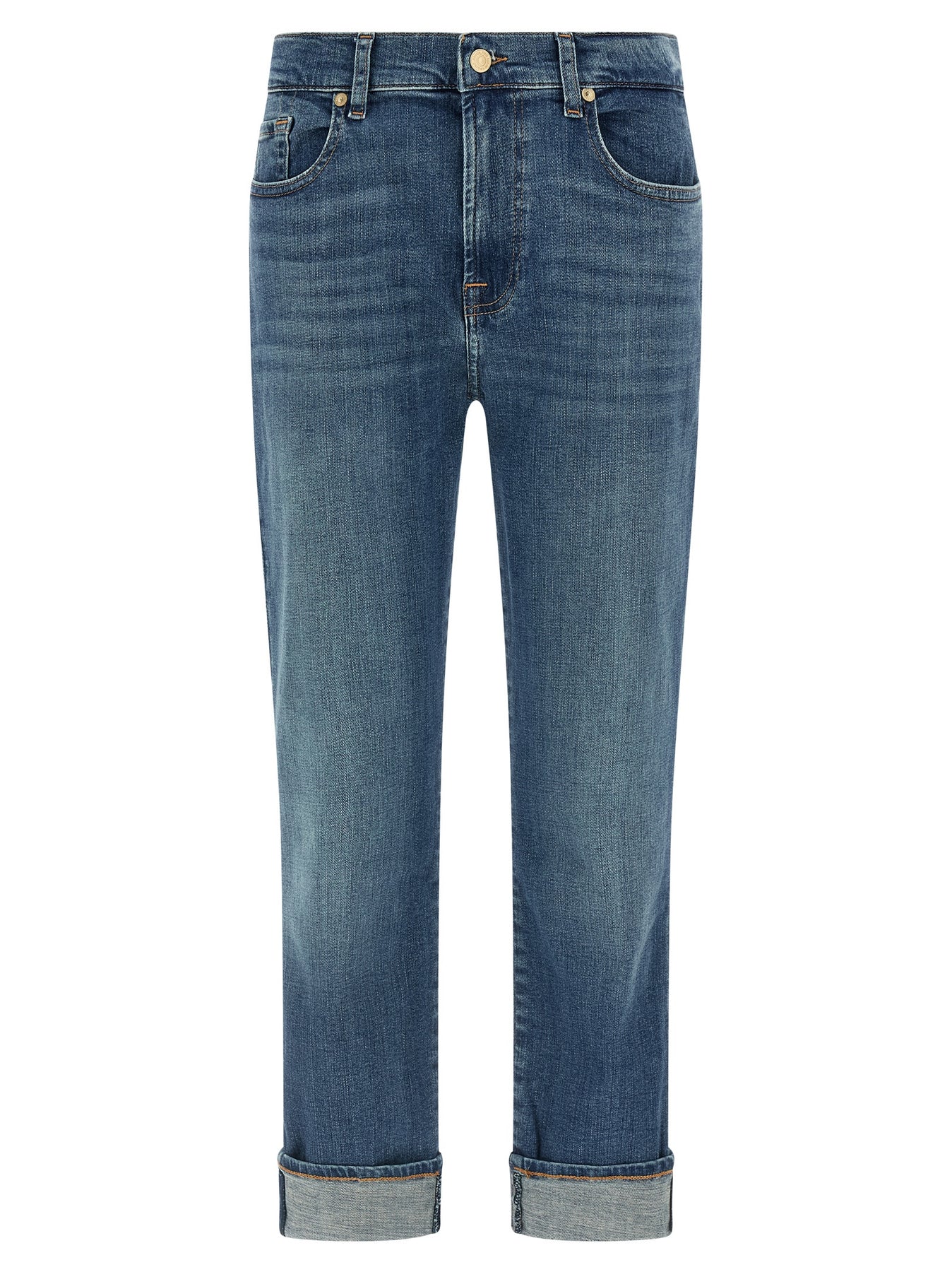 'Relaxed skinny' stretch cotton denim jeans, medium waist with slightly 'Baggy' crotch, narrow leg with turn-up at the hem, zip and button closure.