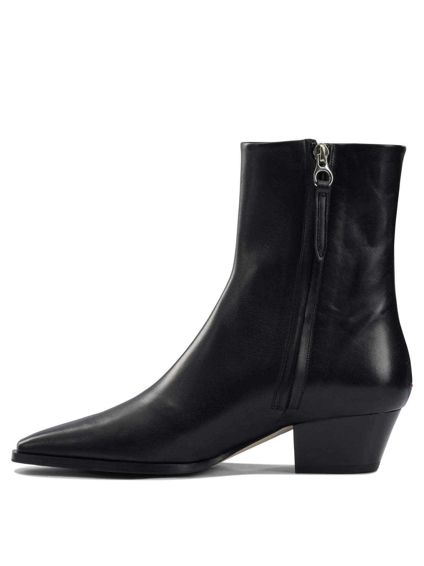 Aeyde "Baba" ankle boots with tapered silhouette construction, upper made of smooth calfskin leather. The line echoes the classic western motif, redefined through essential details. The slanted heel is integrated into the sole and provides structural firmness. The presence of the side zipper optimizes the fit. Contoured upper edge and clean lines complete the structure of the model. || - Smooth calfskin leather - Side zipper closure - Oblique heel integrated into the sole - Slightly pointed toe - Leather-lined interior - Leather and rubber sole