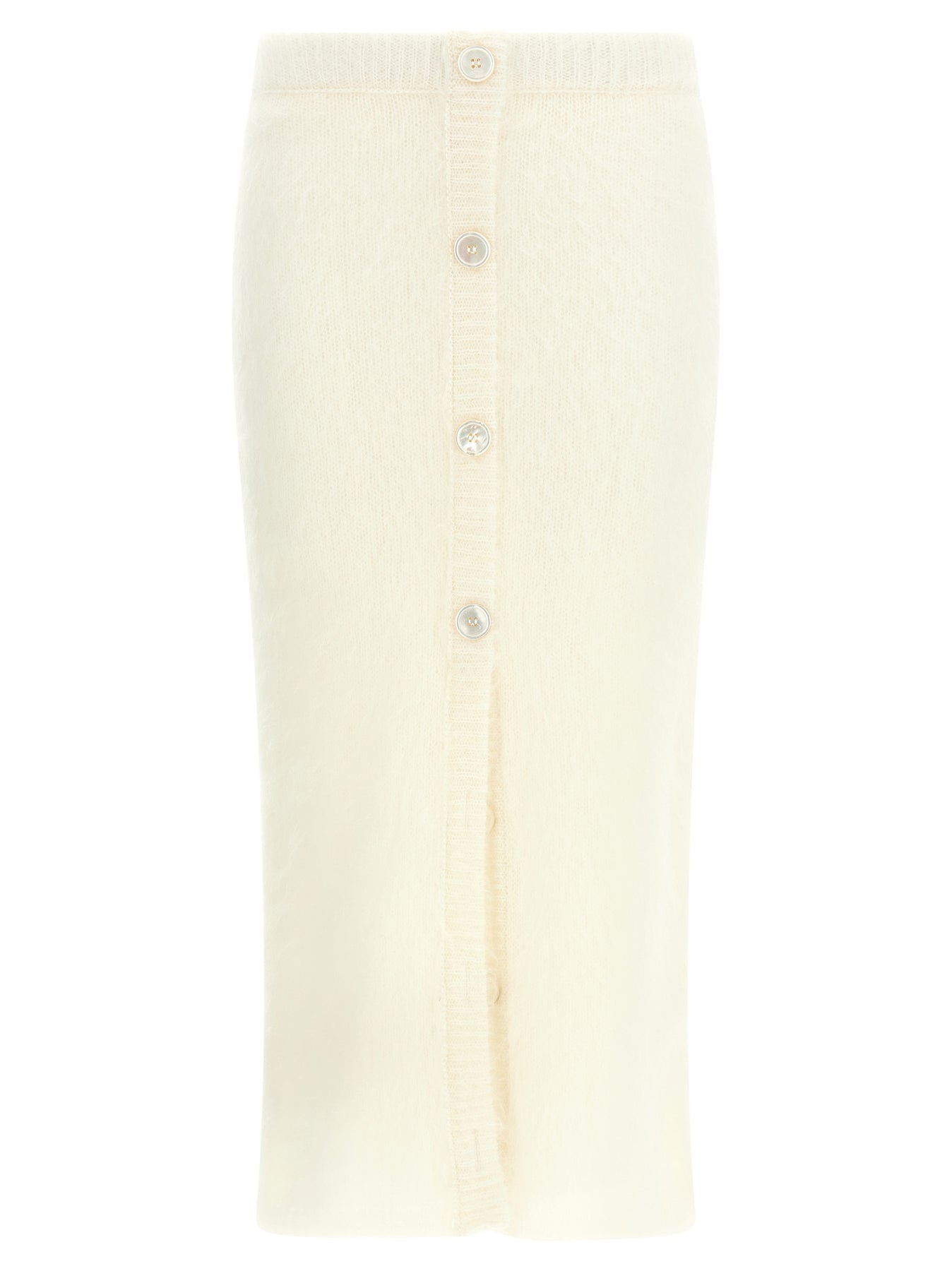 'Carded mohair' wool knit midi skirt, sheath dress style with elastic waistband and front opening with buttons.