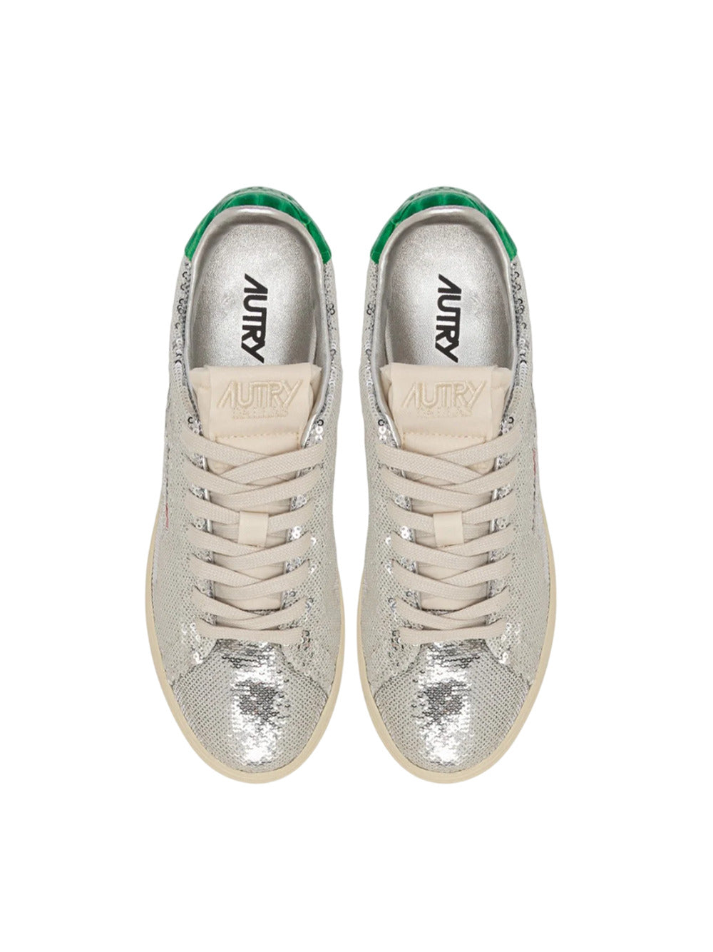 DALLAS LOW SPARKLING SNEAKERS IN SILVER AND GREEN SEQUINS Autry presents Bloom, The most iconic sneaker silhouettes are reinterpreted with sophisticated details and unexpected textures: from velvet to laminated leather, from nubuck to suede. Each model reveals a distinctive personality, made unique by romantic floral embroidery, sparkling sequins and glamorous crystals, graphic micro-studs, or oversized bows. Each sneaker becomes a style statement, an authentic and free way to express yourself. FEATURES: Sequined upper. Flat cotton laces. Jacquard logo. Embroidered label sewn onto the tongue. Padded collar. Leather and cotton terry lining. 2 cm raised leather insole. Rubber sole. Sole height: 2.5-3.5 cm. Personalized fabric pouch. COMPOSITION: Upper: 80% polyester, 15% nylon, 5% leather Lining: 40% leather, 50% cotton terry, 10% nylon ID ADLWTI01