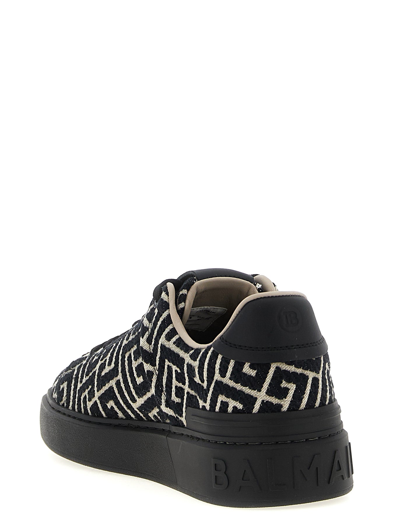 Jacquard canvas B-Court sneakers with PB labyrinth monogram and calf leather details, lace-up closure, thick rubber sole with embossed logo.