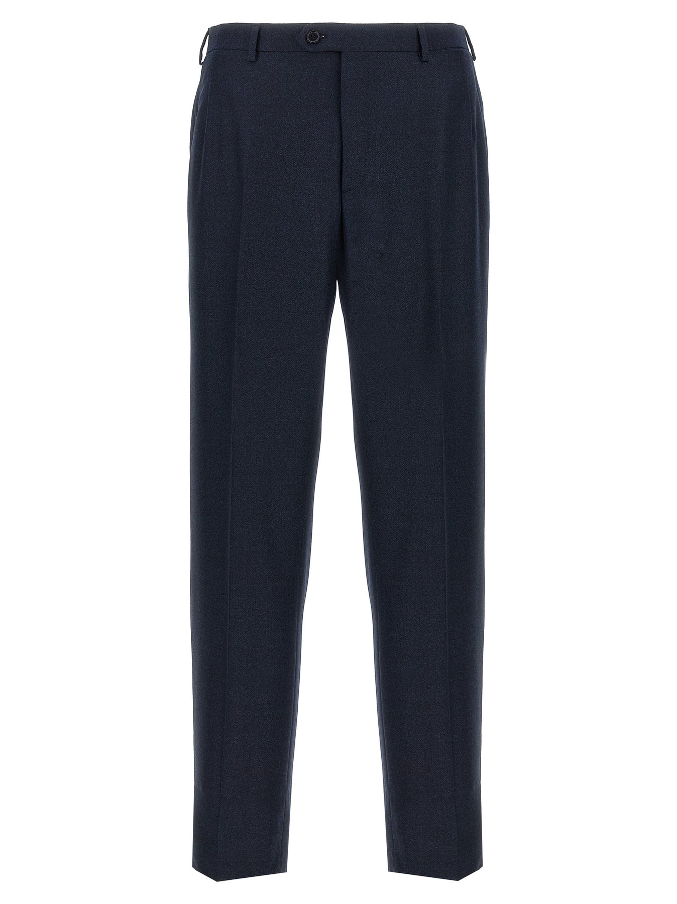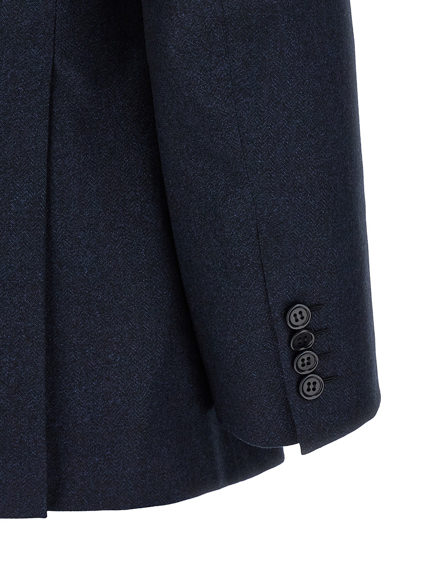 'Lipari' micro patterned herringbone wool dress consisting of a double-breasted blazer with front button closure, peak lapels, structured shoulder strap, cupro lining, breast pocket, flap pockets, cuffs with opening buttonholes, back slits and pants with pleats, stretched pleat, front 'americane' pockets, back welt pockets, zip and front button closure.