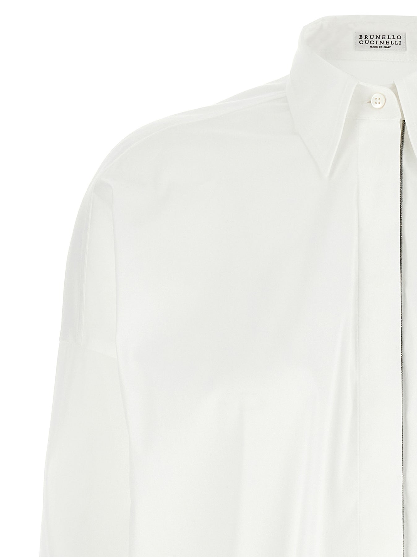 Stretch cotton poplin shirt with front Monile detail, button closure, long sleeves with rollable cuffs and dropped shoulders.