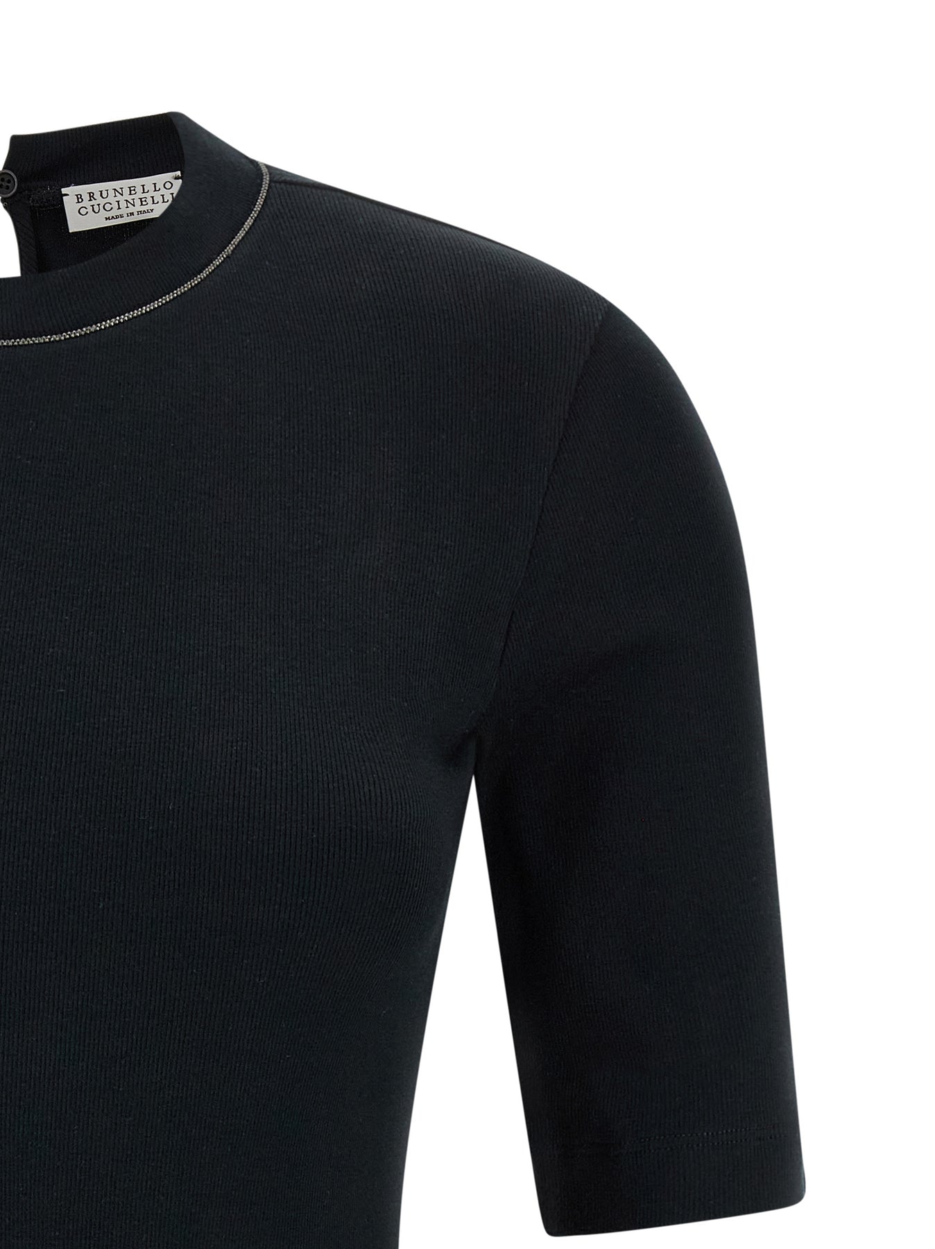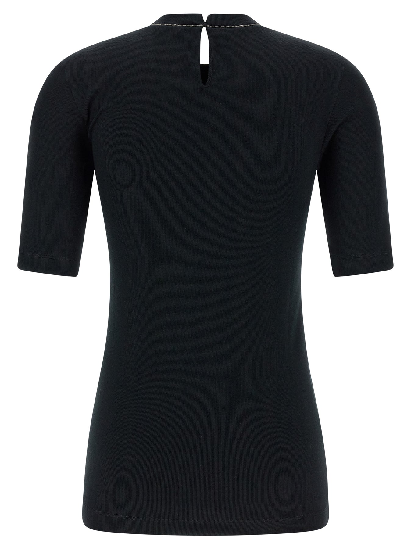 Ribbed stretch cotton jersey T-shirt with Monile detail, back button closure, and short sleeves.