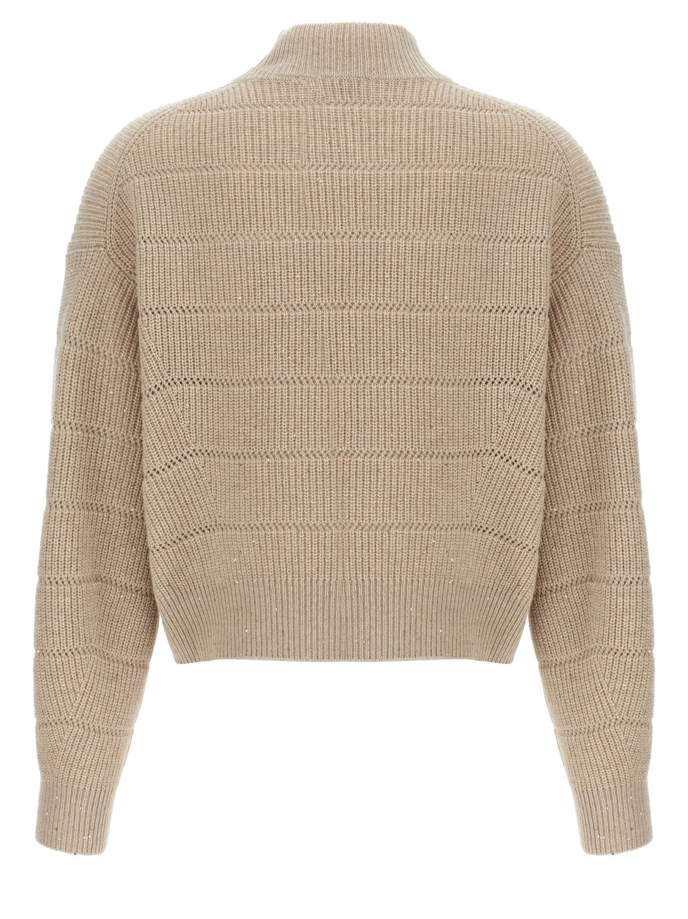 Rustic Dazzling Net' crochet wool sweater with all-over sequin appliqué, crop style, high neck, long sleeves with cuffs and dropped shoulder.