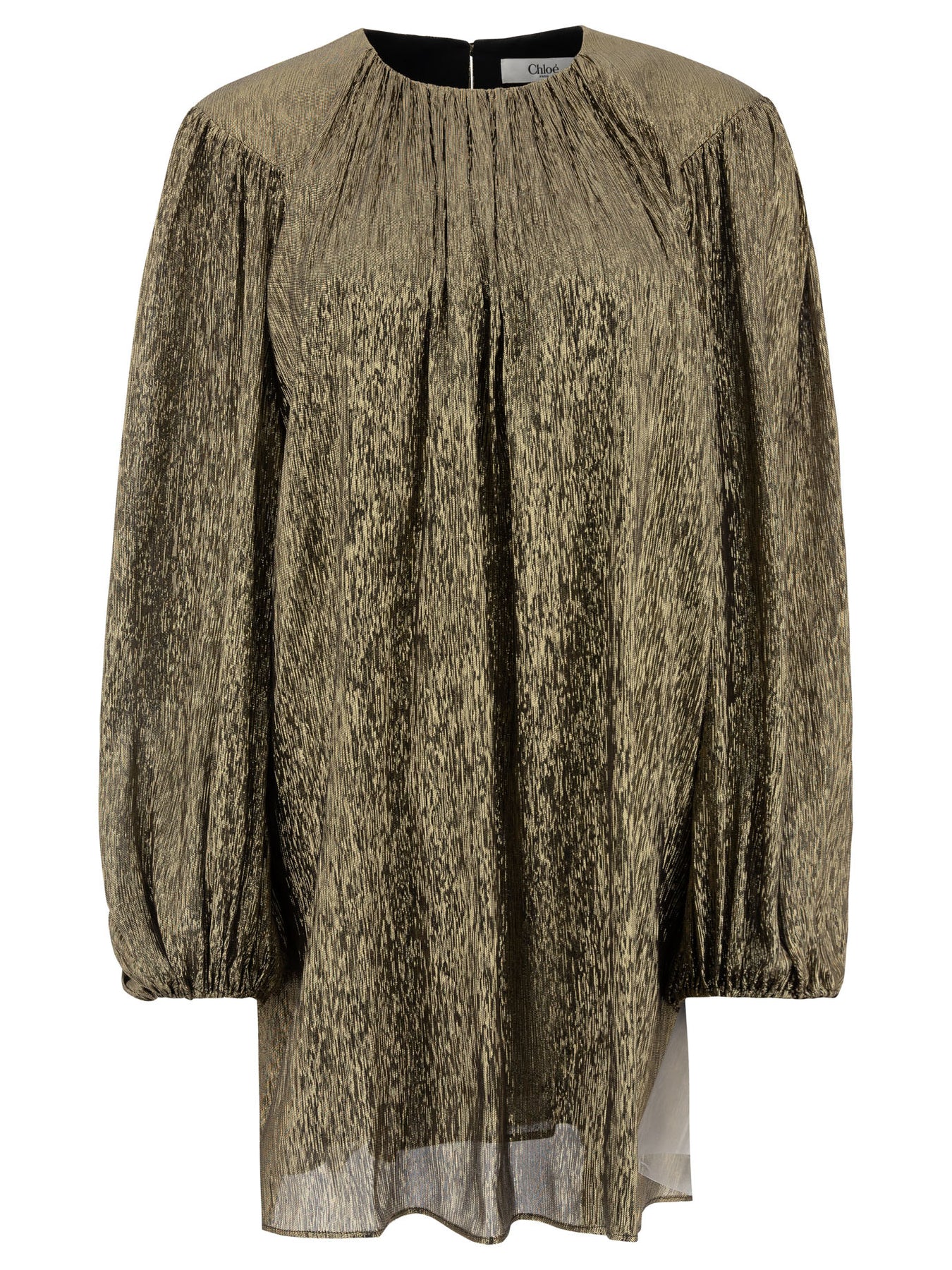 A Chloé silk flared dress, the construction features a flared silhouette characterized by fluid lines that follow the body without constricting it. The construction includes long sleeves and essential details, with clean seams and a minimal finish. || - Solid color - Flared dress - Long sleeves - Flowing lines and essential structure - Regular fit