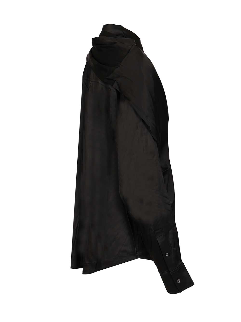 Button-up blouse crafted from a lightweight, flowing satin fabric by Acne Studios, featuring a scarf detail. Loose-fitting and hip-length.