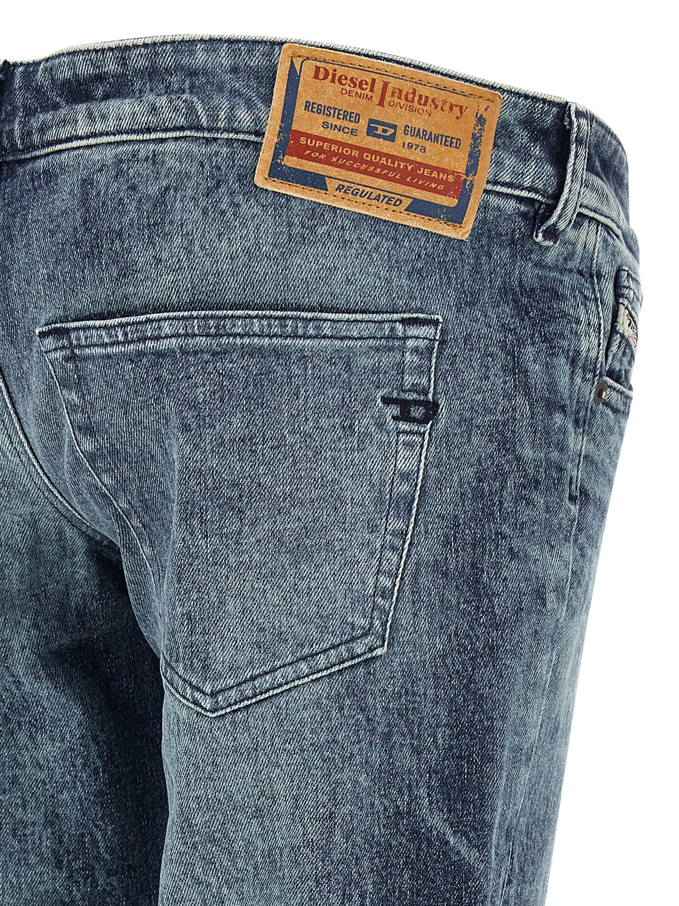 'D-Waisty' slightly stretch cotton and hemp denim jeans with whisker effects, straight leg, extra low waist with adjustable inner insert to keep the jeans perfectly in place, front button closure, five pockets, back logo tag.
