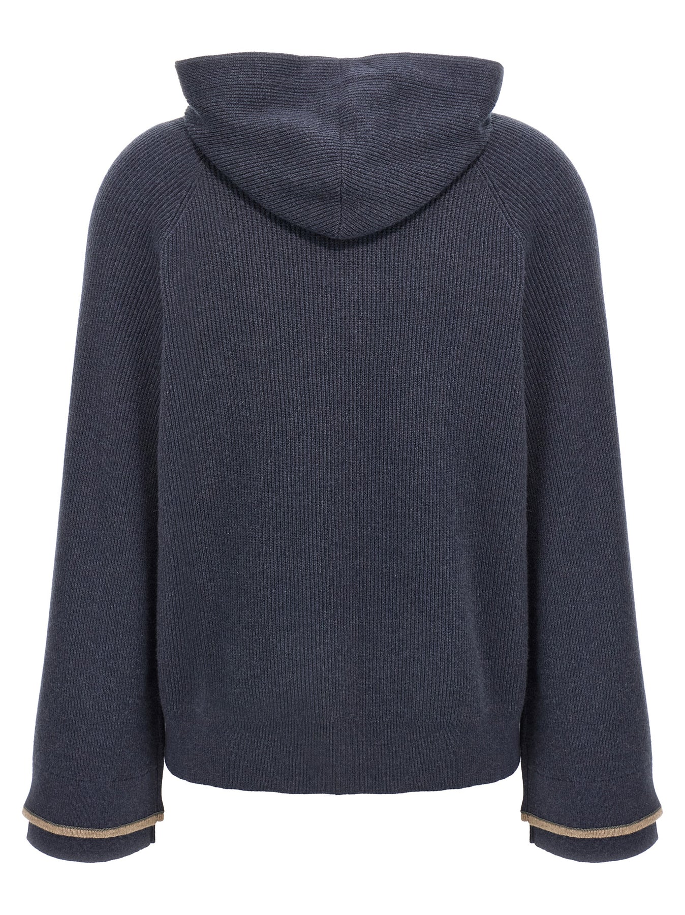 Ribbed wool, cashmere and silk blend sweater, hood, long flared sleeves with double cuffs and contrast detail and Monile.