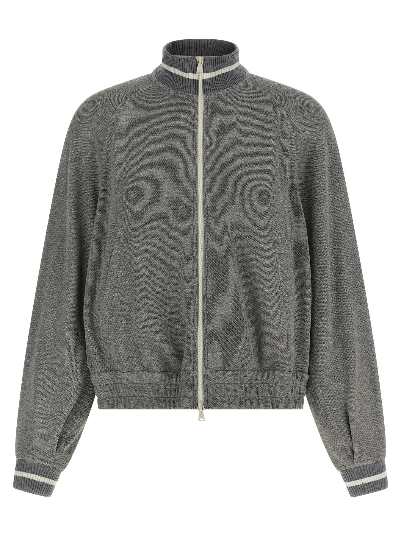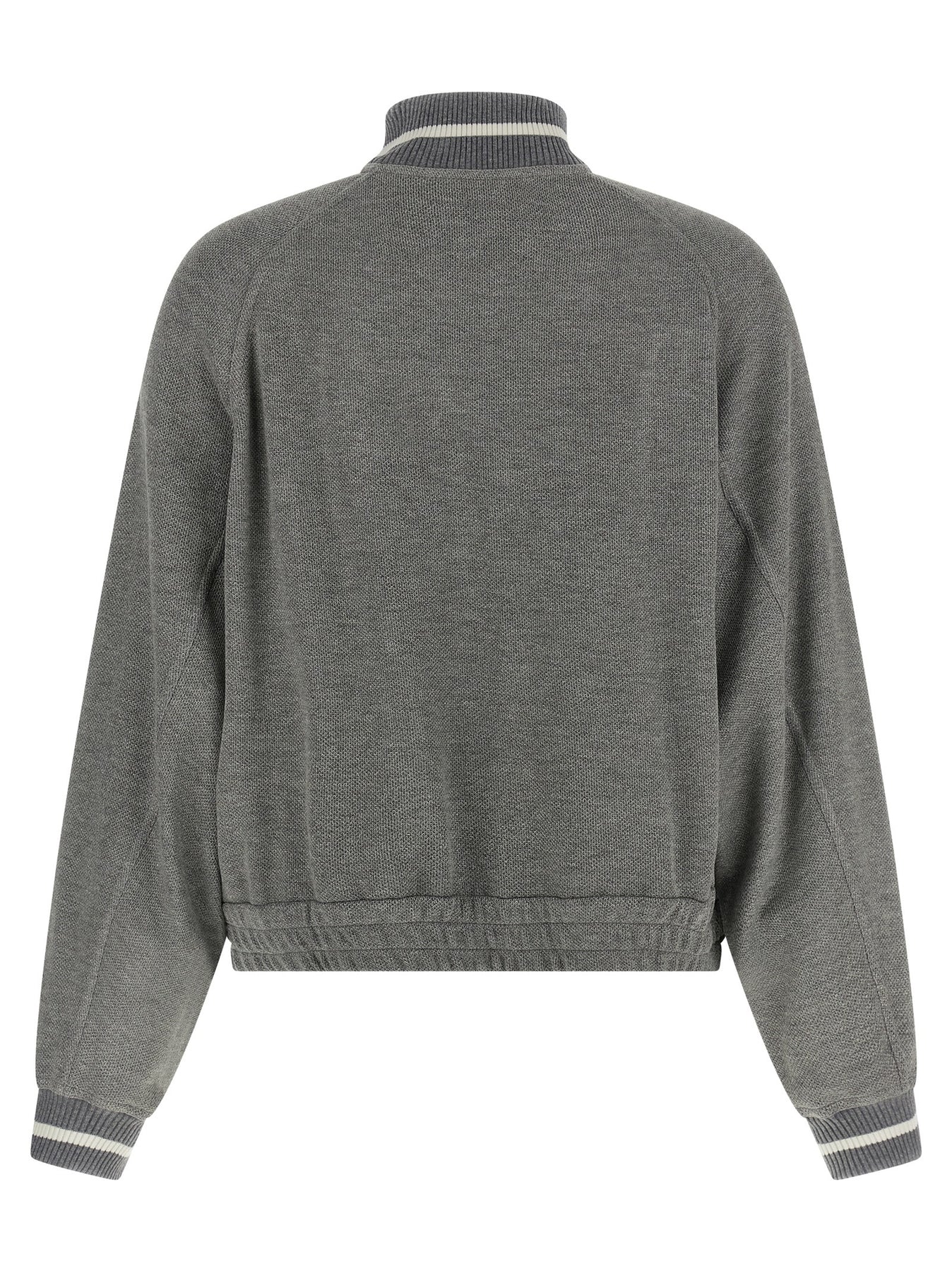 Cotton and viscose 'Sparkling' piqué sweatshirt with lamé thread and stretch ribbed knit details, cropped bomber jacket styles, high neck, front zip closure, pockets, long sleeves with cuffs and dropped shoulders.